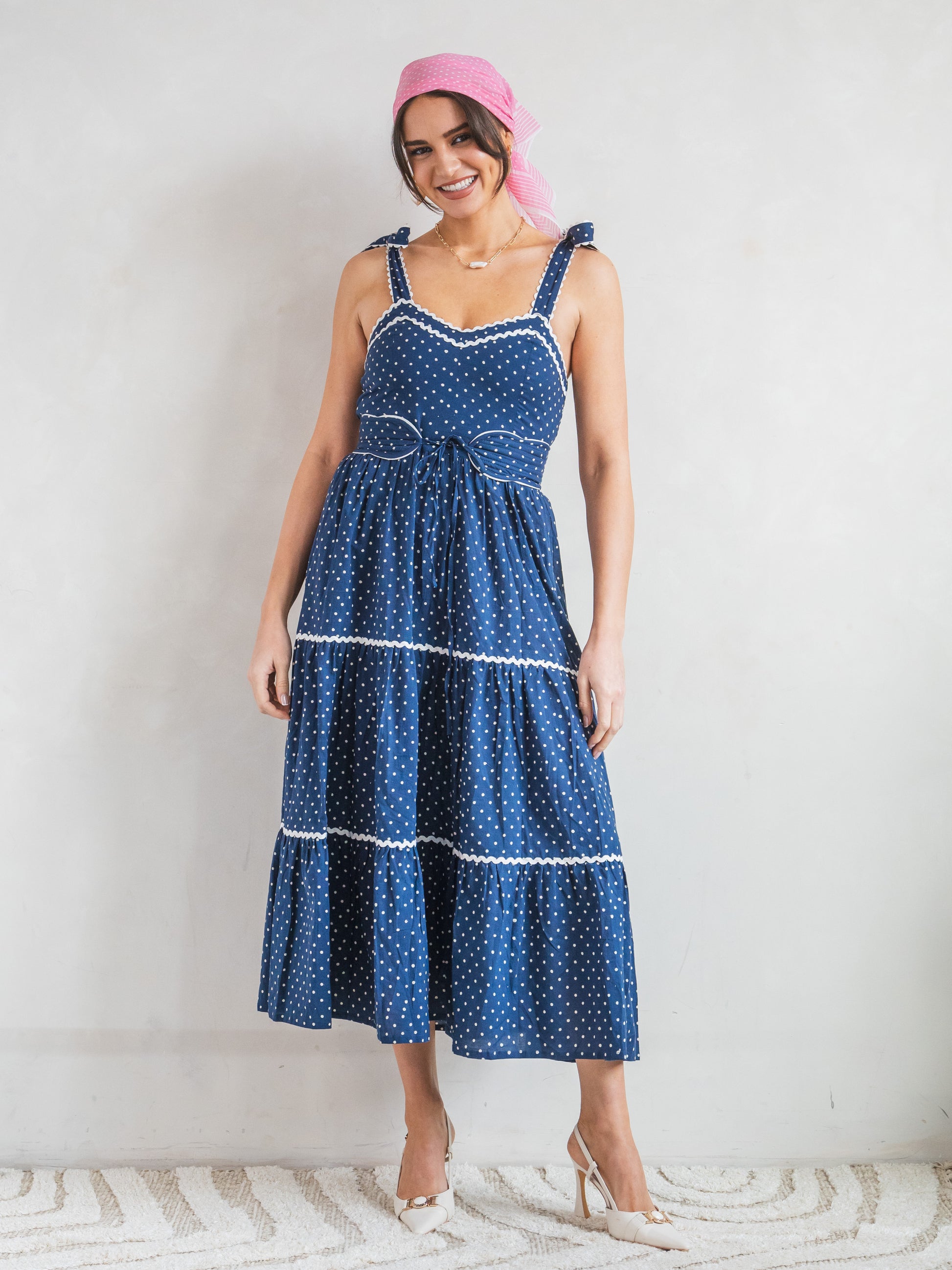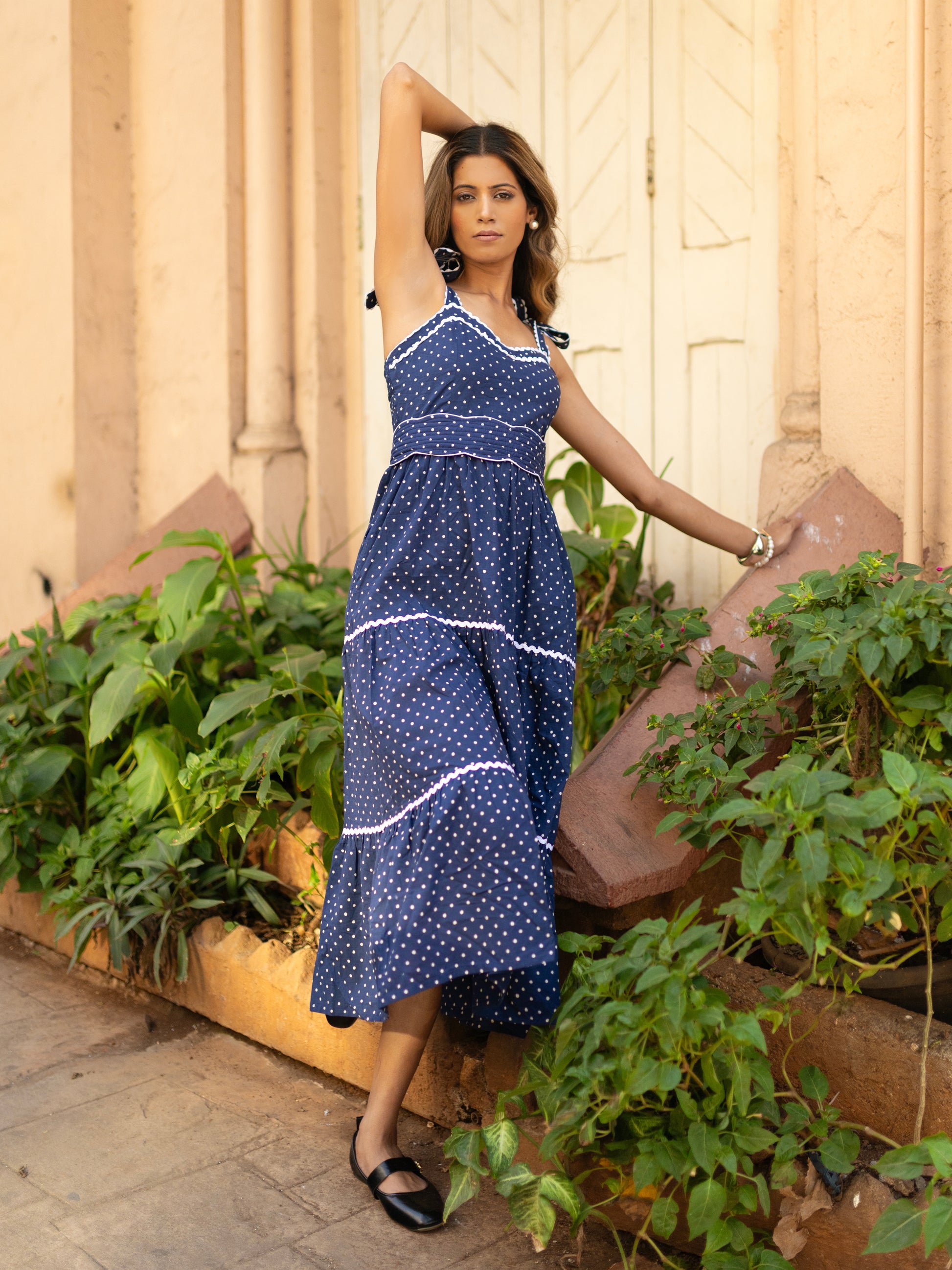 Our dreamy ‘Amore’ sundress is back, this time with a playful and effortlessly chic navy polka dot design. She'll take you from days on the beach to poolside sundowners followed by al fresco dining in buzzy tavernas. She promises to be your go-to piece for a touch of Mediterranean charm. Made of crisp cotton, she will keep you cool and comfortable while exuding vibrant charm.