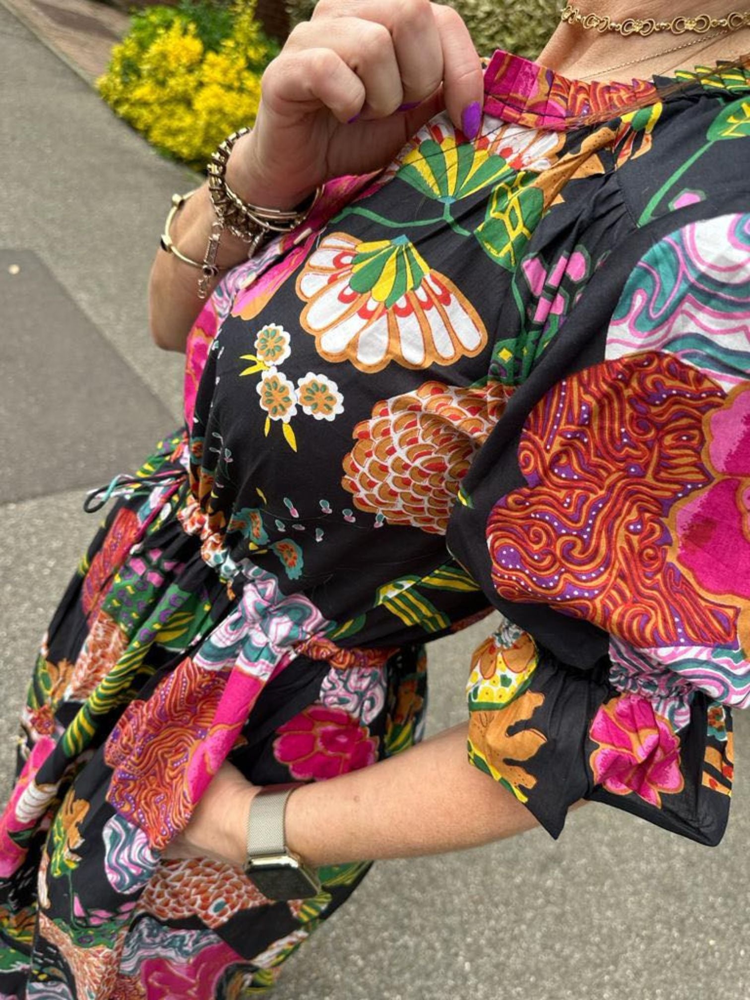 Such a beautiful dress in lovely colours and in cool cotton. I can wear it with or without the belt and the sleeves are also adaptable. It feels gorgeous on.