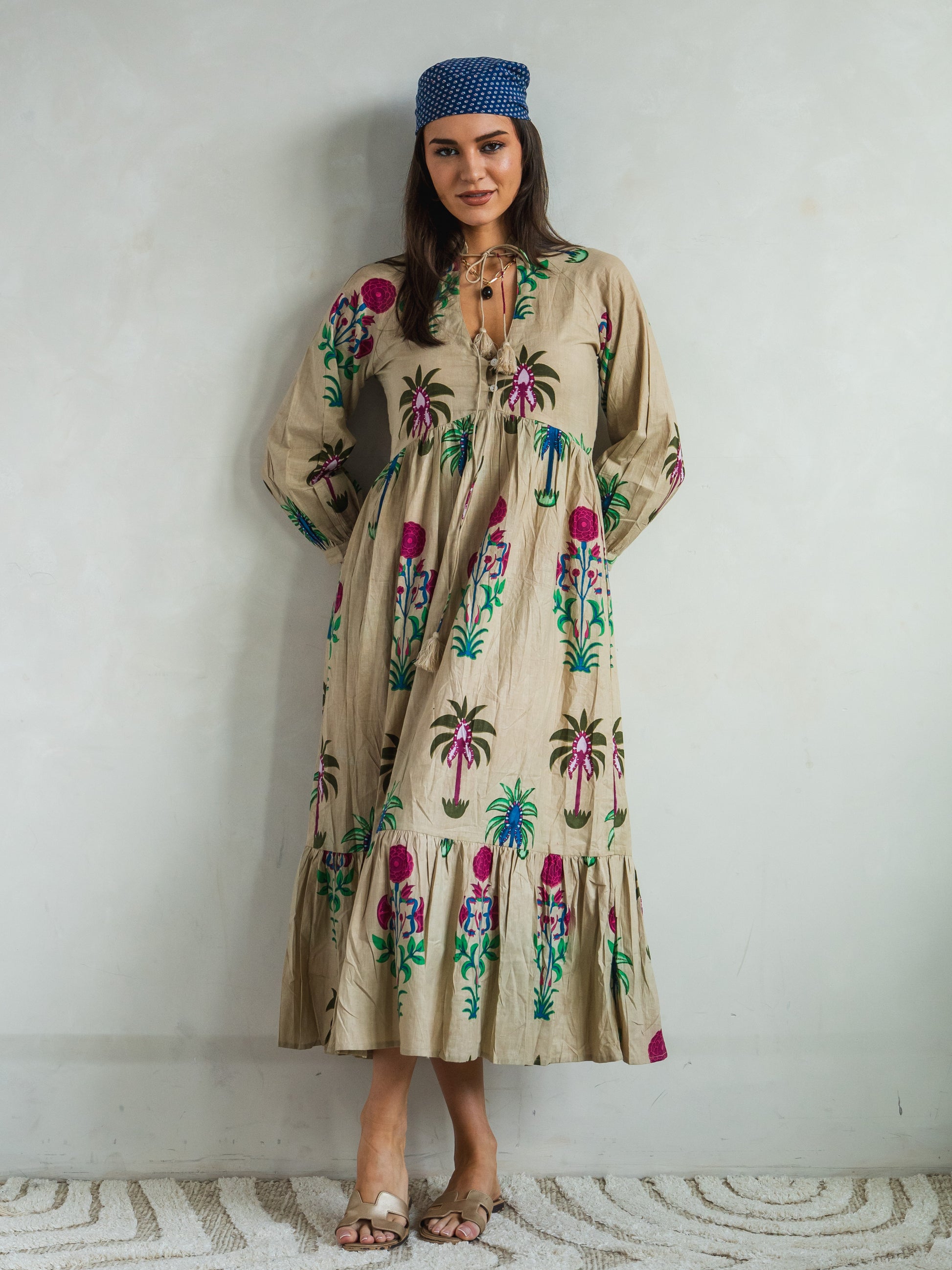 DISTINY is one seriously beautiful dress, the shades, hues, colours ,tints all combine to flatter the wearer. When worn, this dress drapes and flows most comfortably and looks graceful .I love its flow ,its long sleeves and comfortable belt and neckline. The tassels and buttons and intricate stitching make it unique. DISTINY is very feminine. I love its length. The cotton feels warm and cosy and yet cool and airy on a hot day. Inside I wore a padded T-shirt in kaki , tan sandals and I added a light beige polka dotted chiffon scarf at neck and 2 tonal necklaces and a cross over leopard bag. Again this dress is for all year around. DISTINY can be worn with a tonal knitted pashmina shawl ,coats, gilets, and booties with hats berets in the winter. In the summer , keep it simple. DISTINY is dateless and suits all age groups. A wardrobe staple.