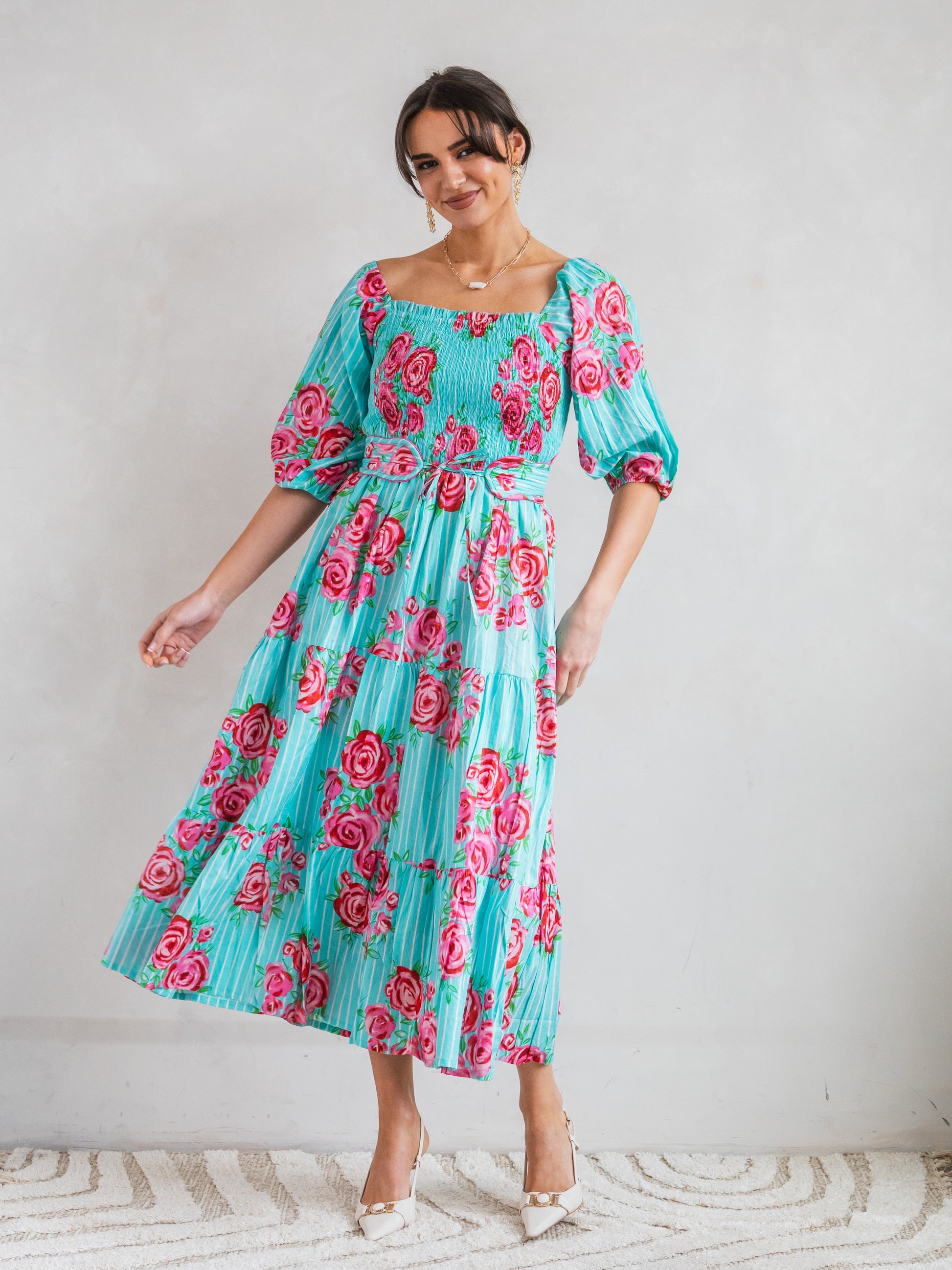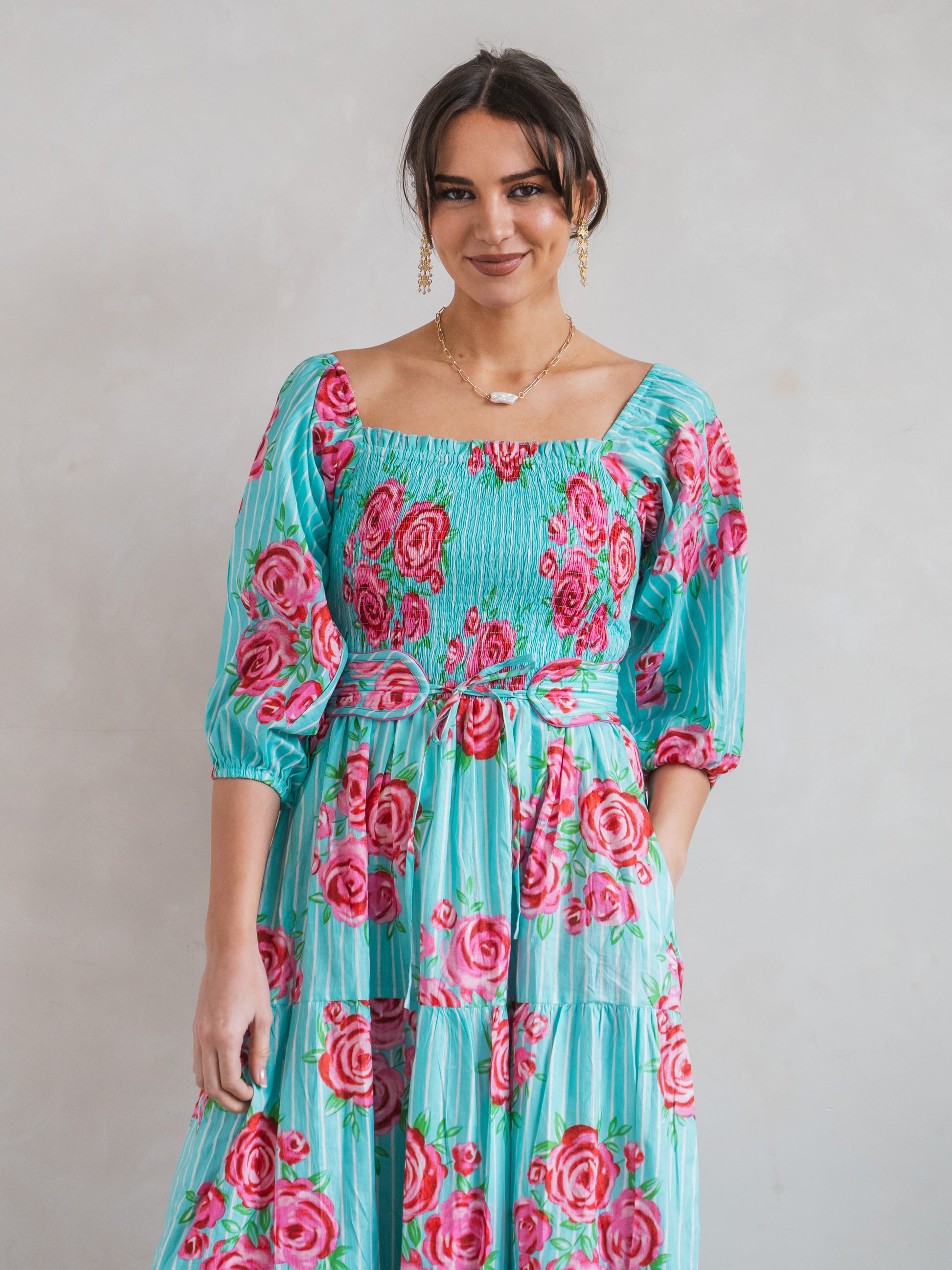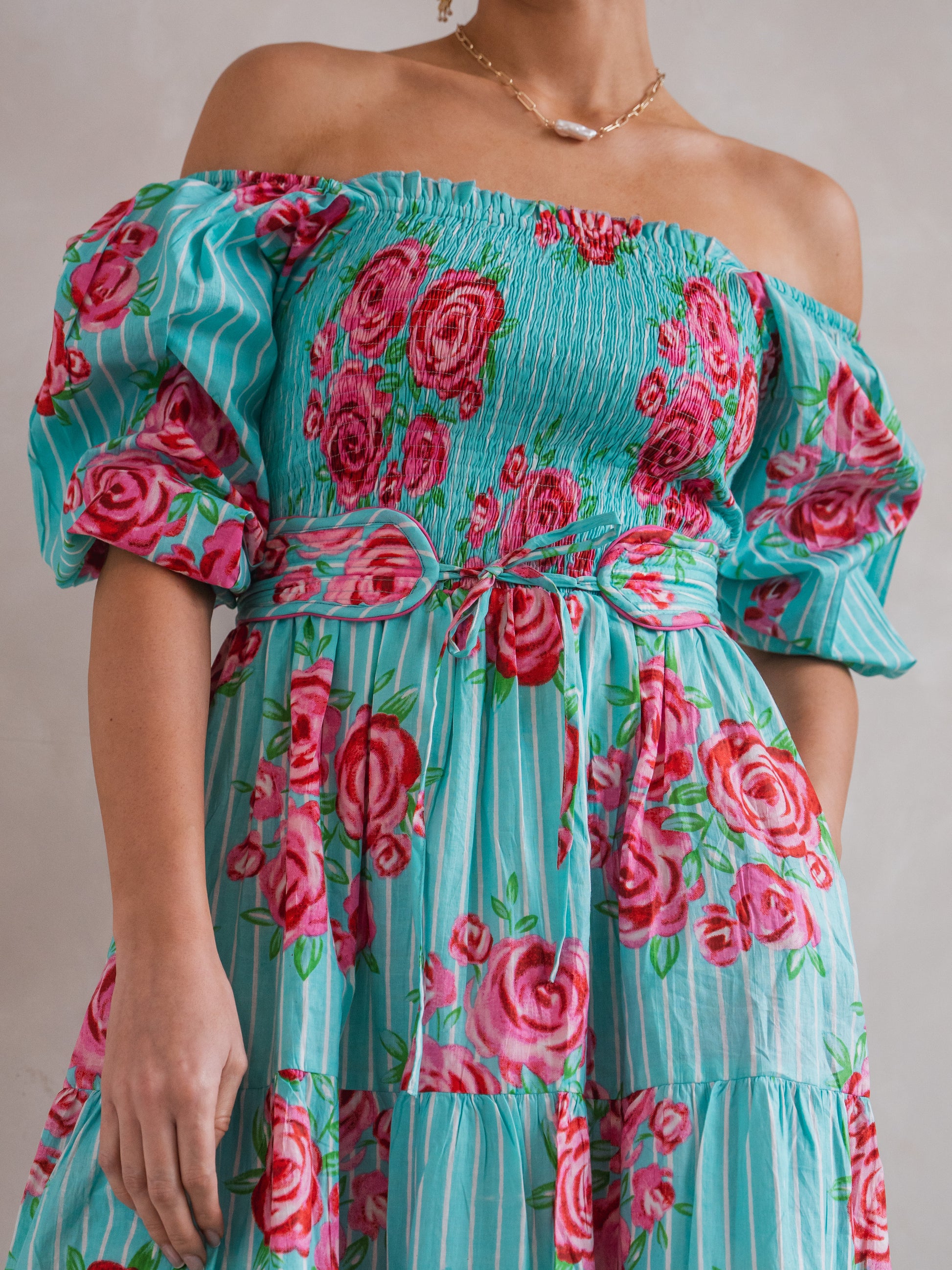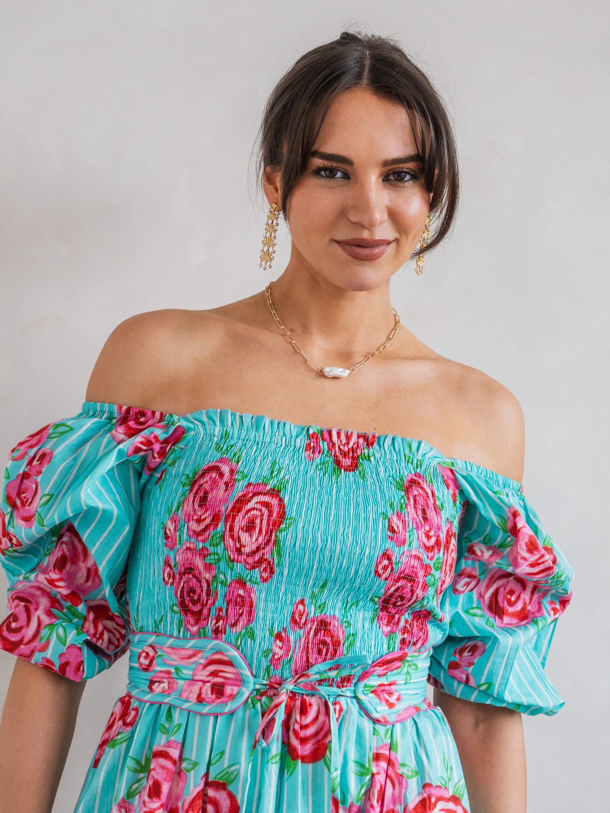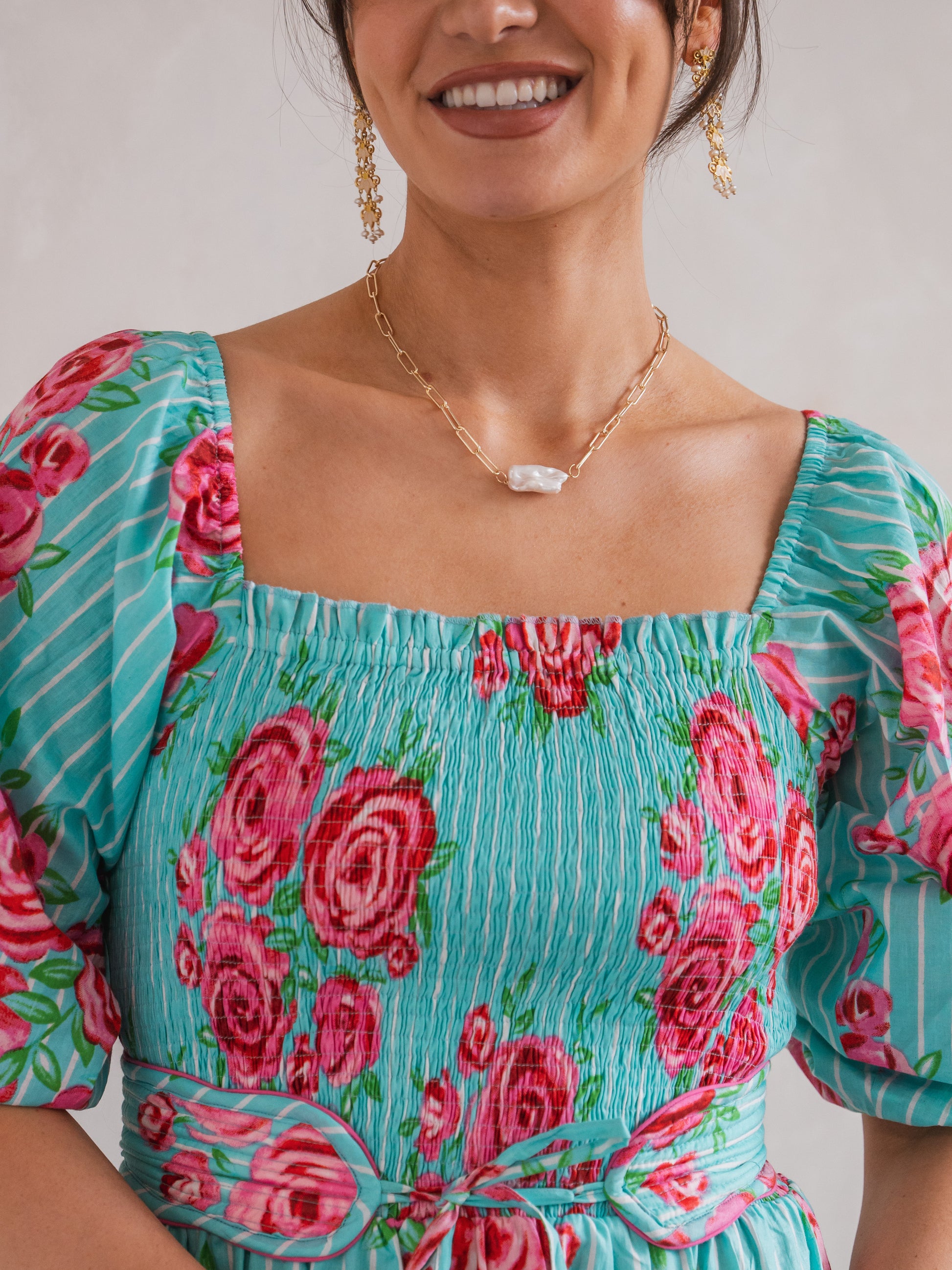 ‘Austin’s Rose’ print, you’ll be giving dreamy, timeless elegance all day long. She has a relaxed, flowing silhouette enhancing its shape, while maintaining a comfortable fit. It has elastic cuffs so can be worn short sleeved or ¾ and can be worn on or off the shoulders. Not to forget she has pockets!! And a quilted belt. Every detail adds to the charming, whimsical feel of Austin’s Rose.
