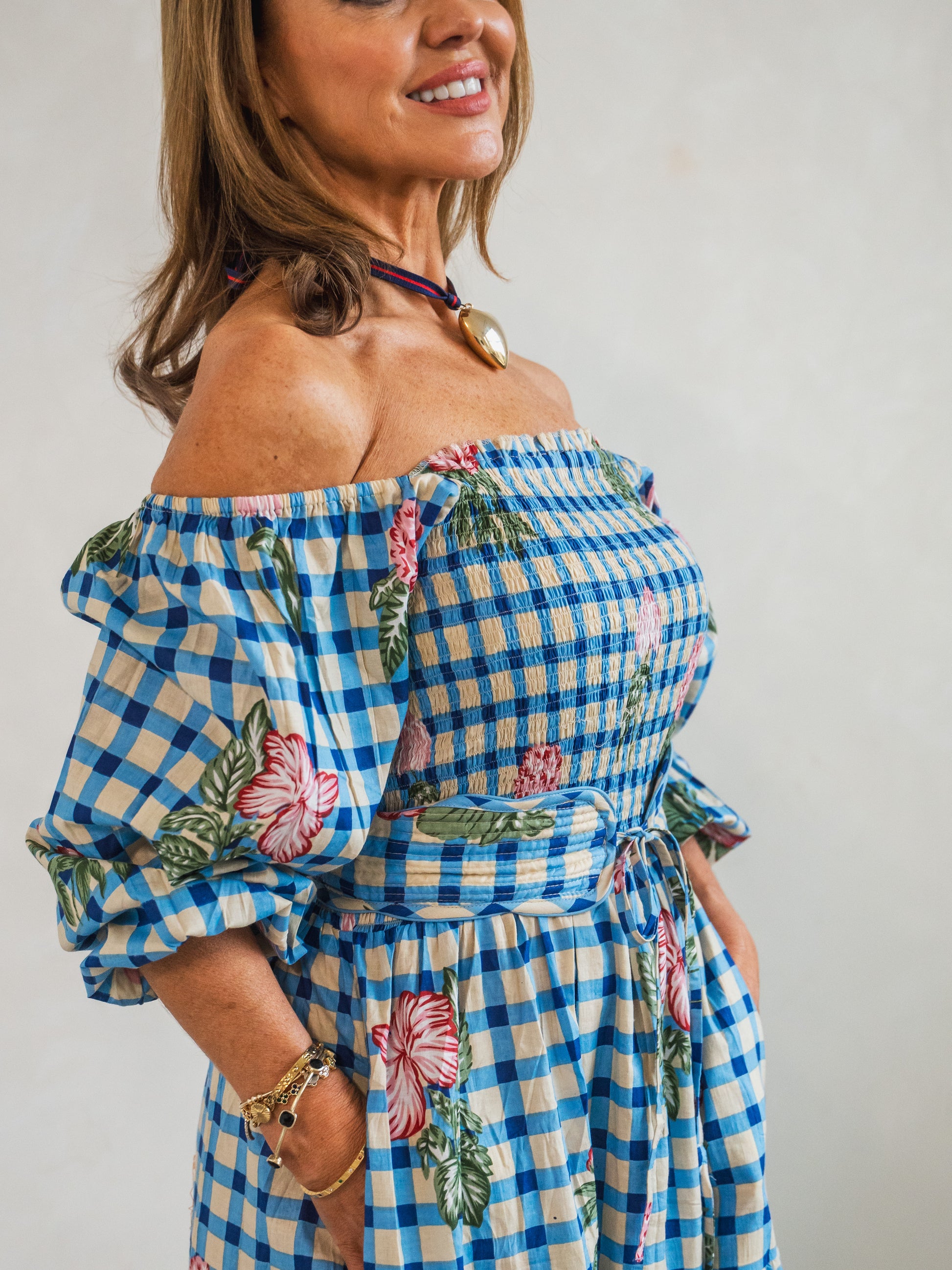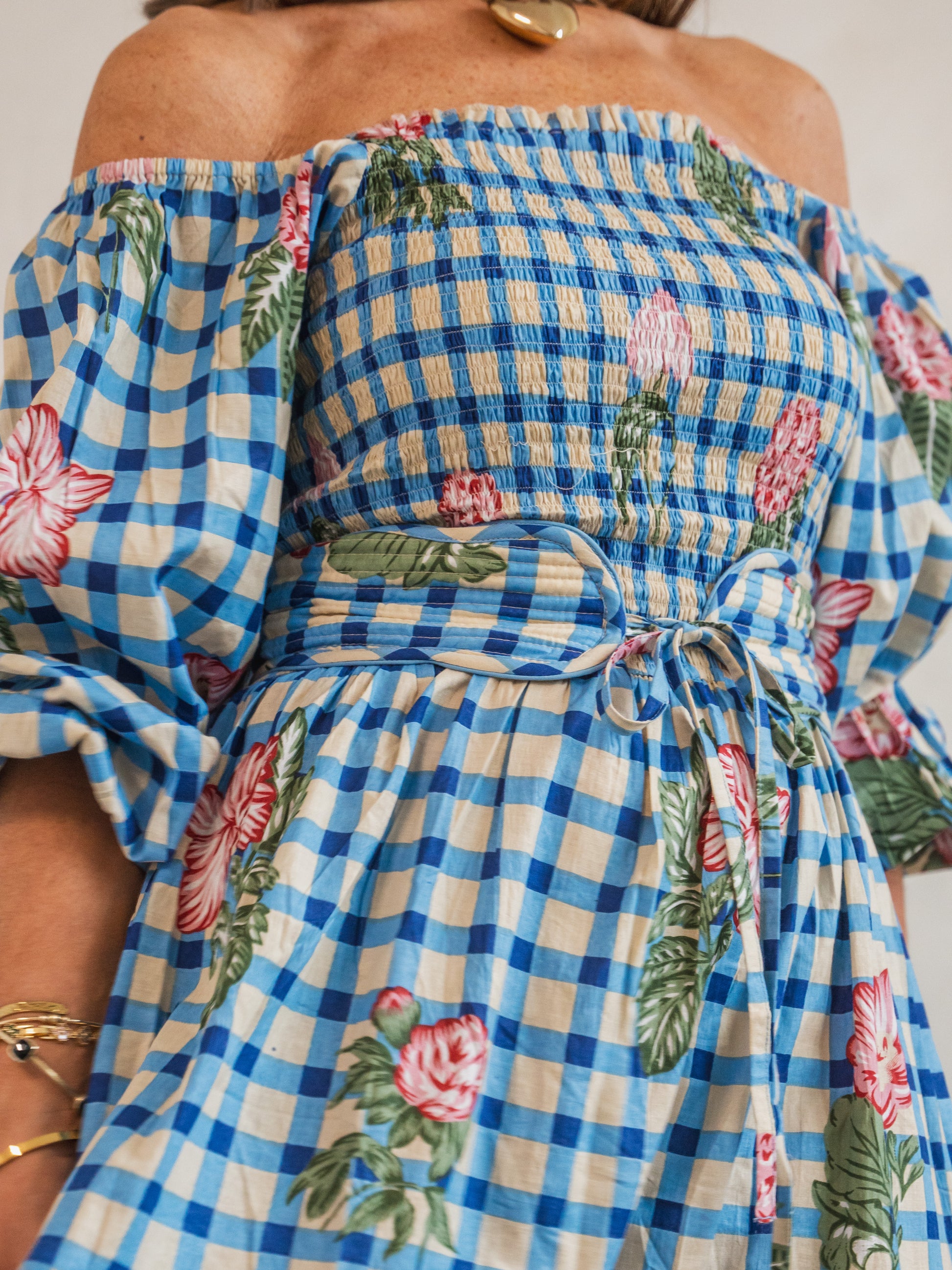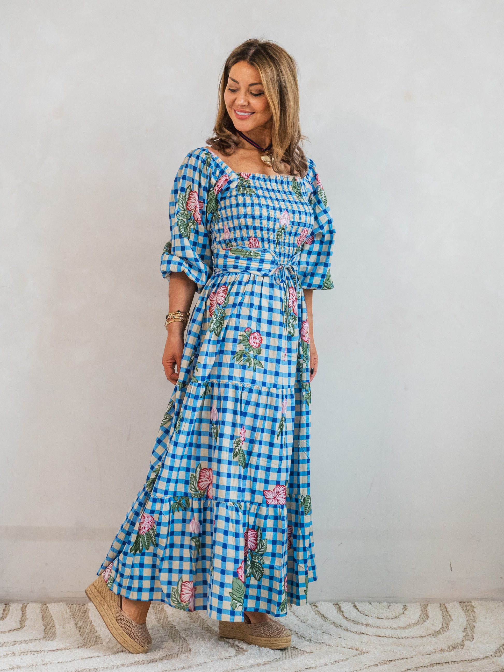 'HONOUR' DRESS IN GINGHAM FLOWER BLUE