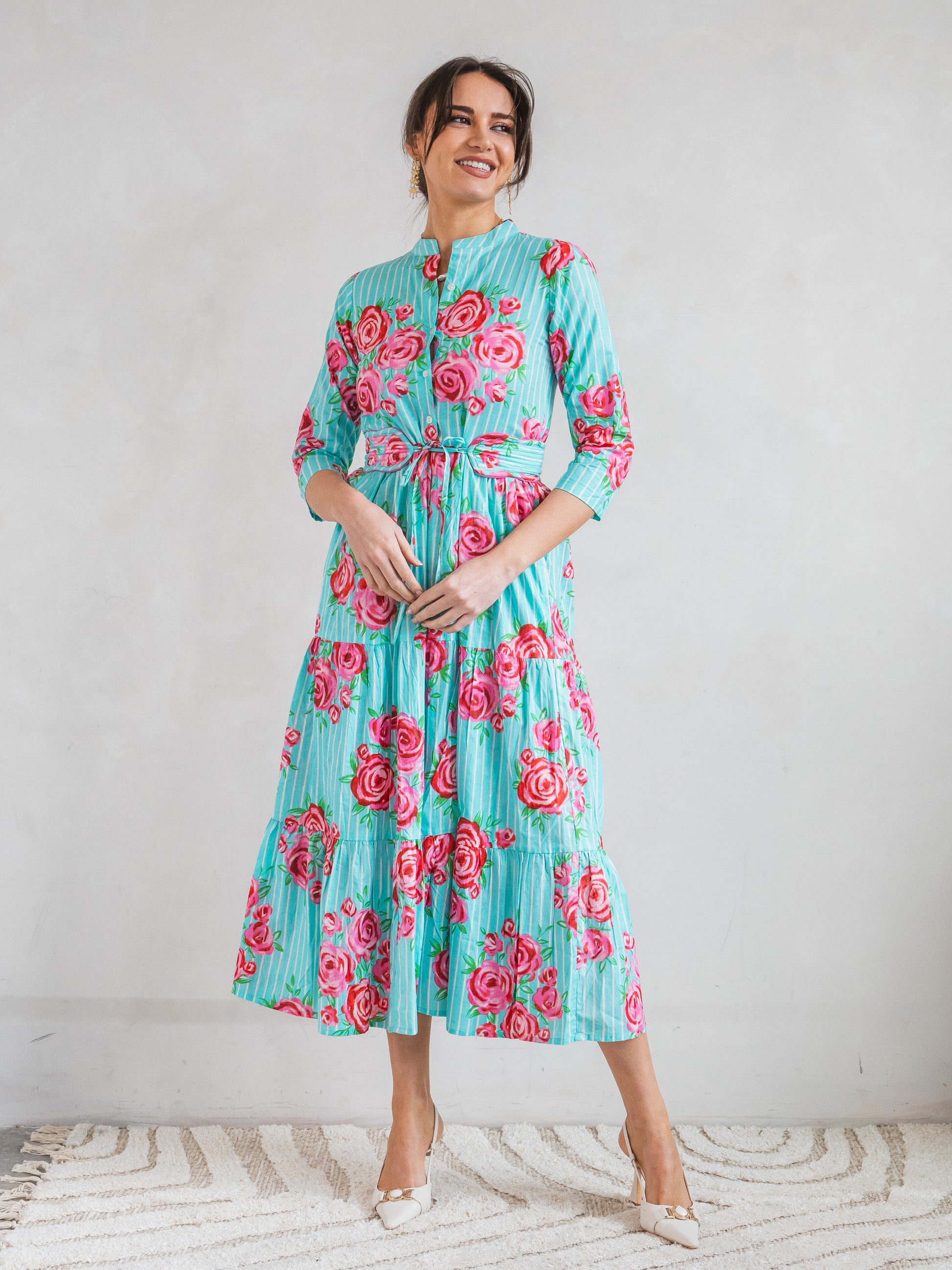 The firm favourite ‘Hope’ is back, this time with a playful teal and white striped floral design. Designed with a sleek, collarless neckline, this dress offers a refined and contemporary silhouette that feels both elegant and easy to wear. The light teal is paired with white stripes, while loud pink and red roses bloom across the fabric. The flattering silhouette, with its graceful flowing skirt, moves with effortless ease. Our ‘Hope’ is as comfortable as it is stylish.