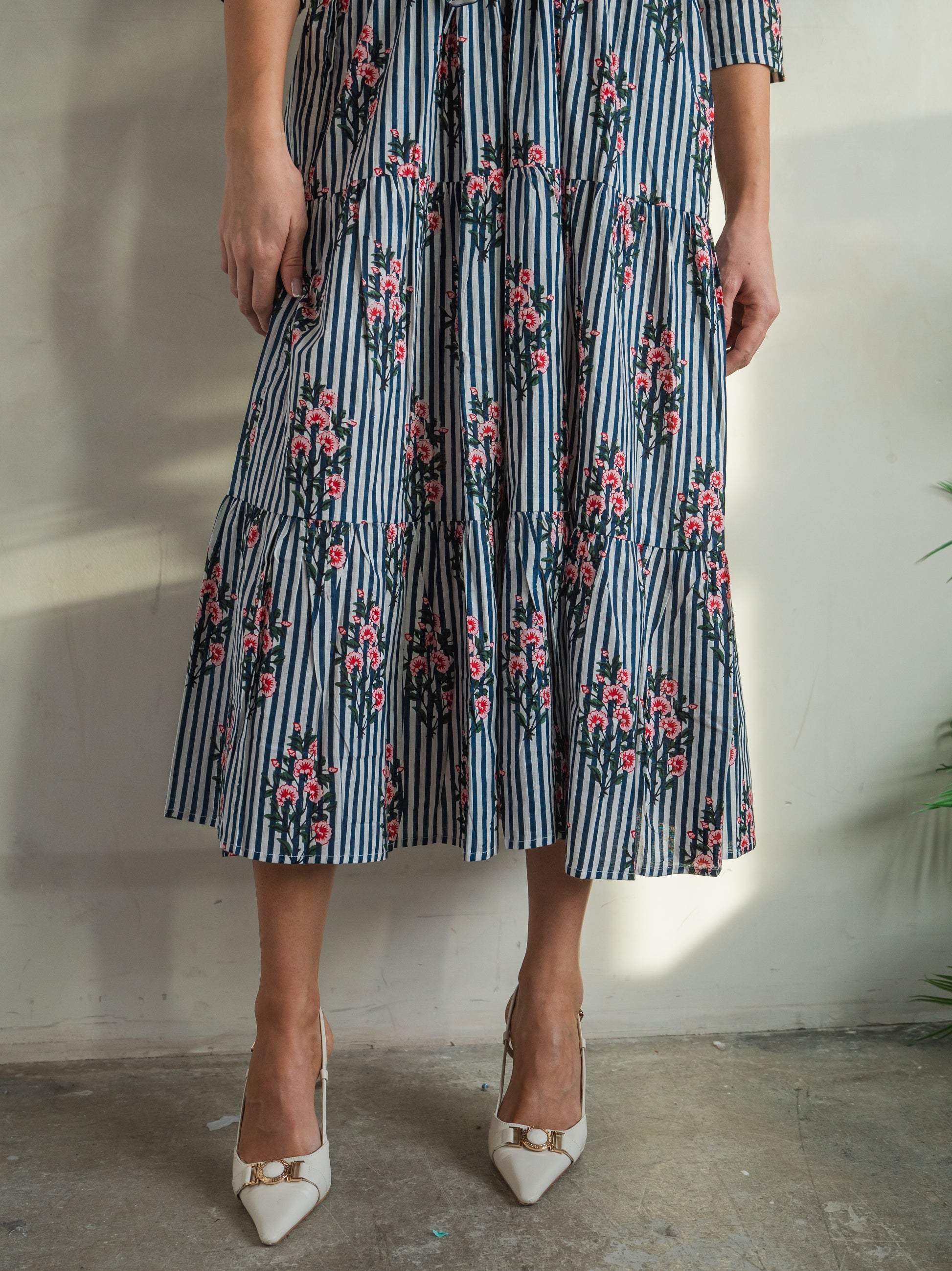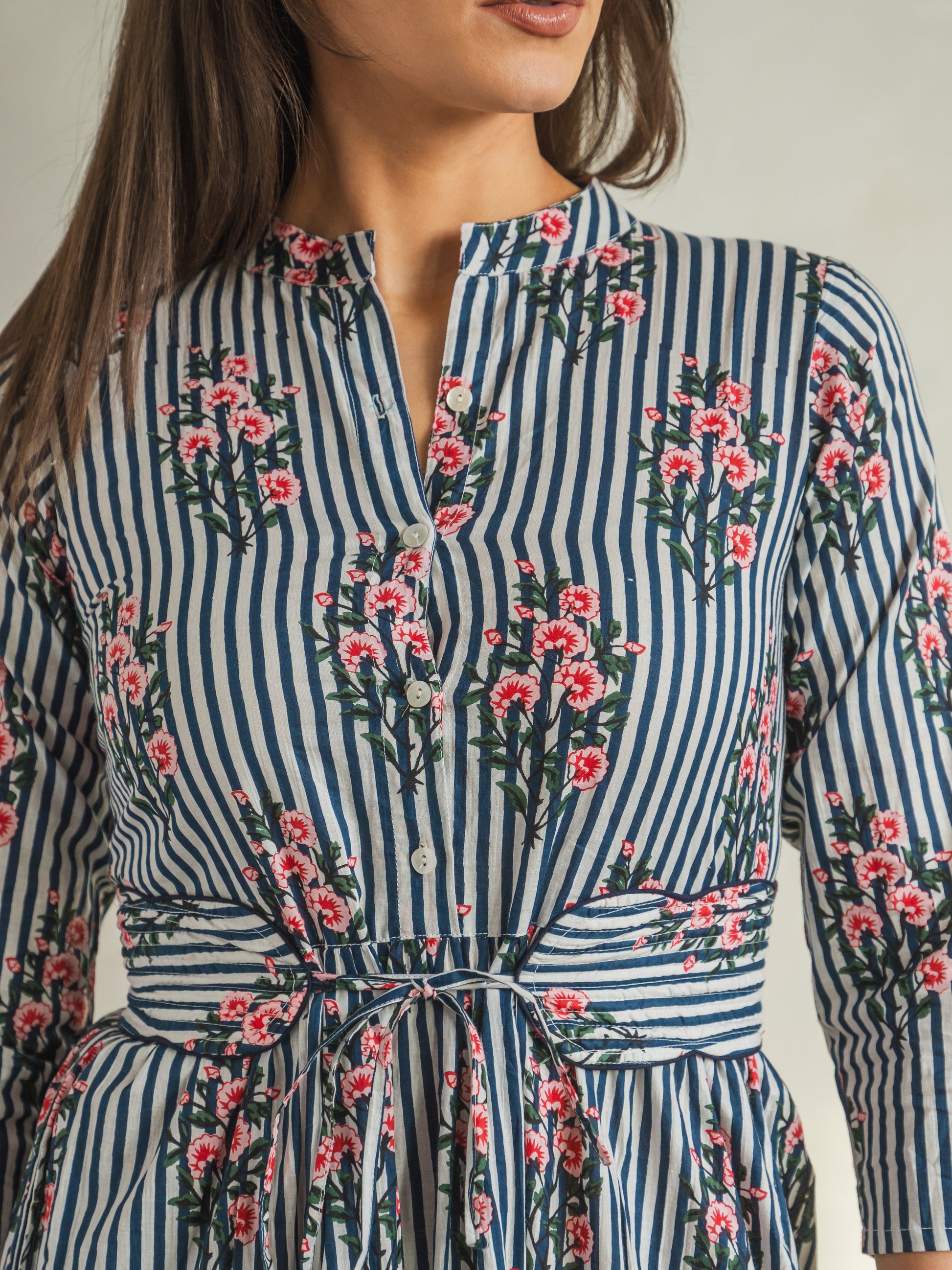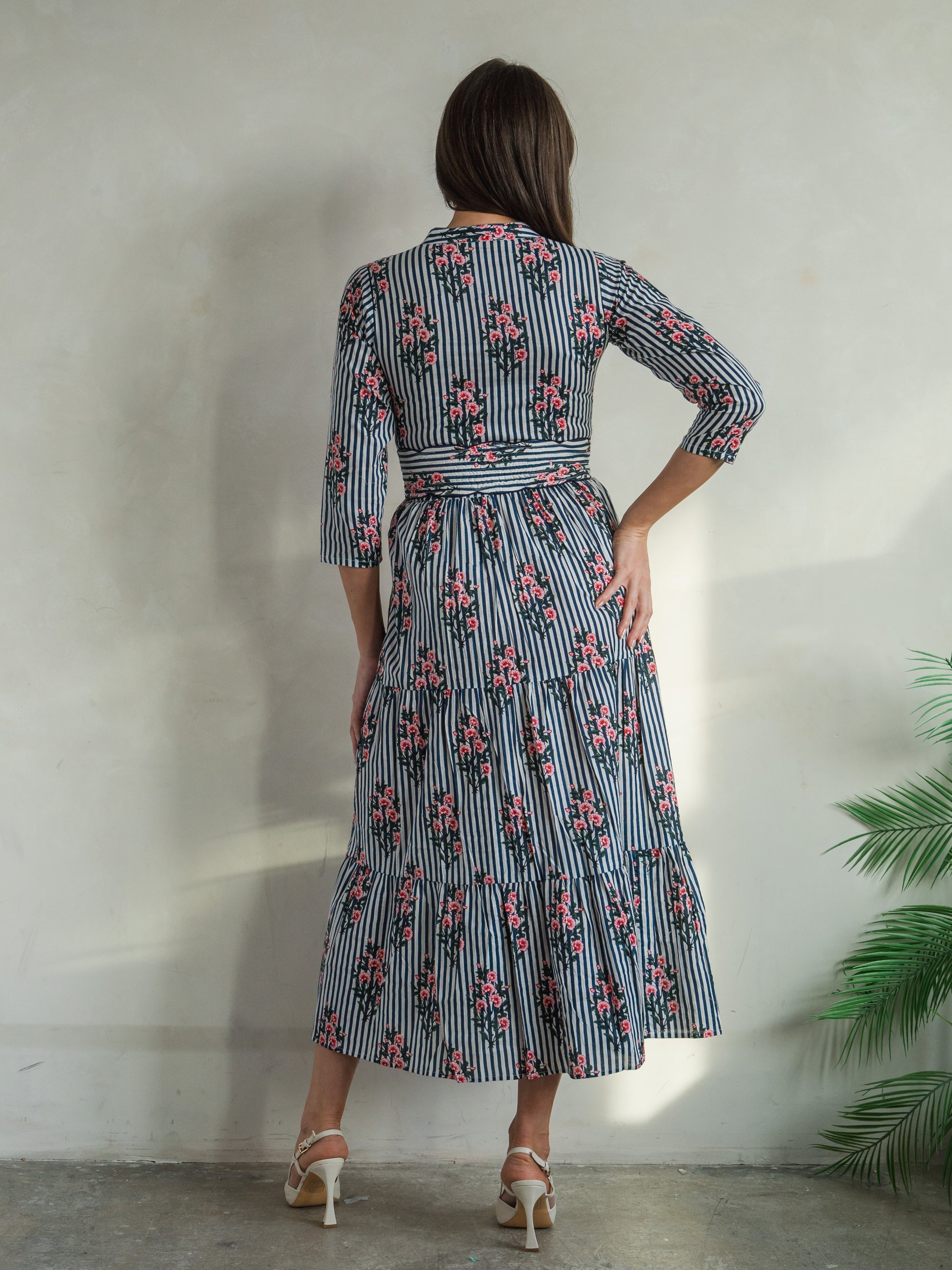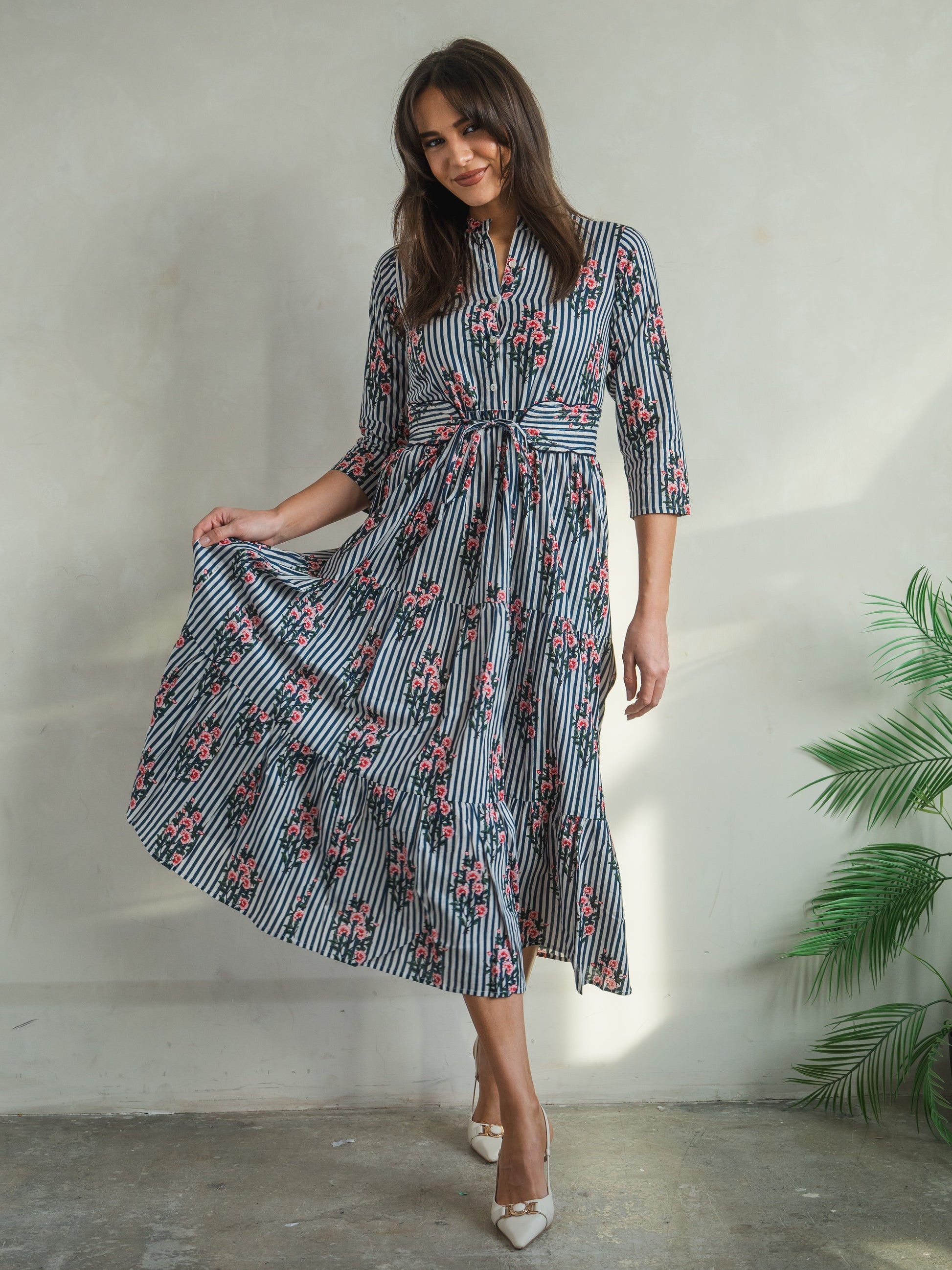 The firm favourite ‘Hope’ is back, this time with a bold navy and white striped floral design. Designed with a sleek, collarless neckline, this dress offers a refined and contemporary silhouette that feels both elegant and easy to wear. The deep navy blue is paired with white stripes, while delicate roses bloom across the fabric. The flattering silhouette, with its graceful flowing skirt, moves with effortless ease. Our ‘Hope’ is as comfortable as it is stylish.