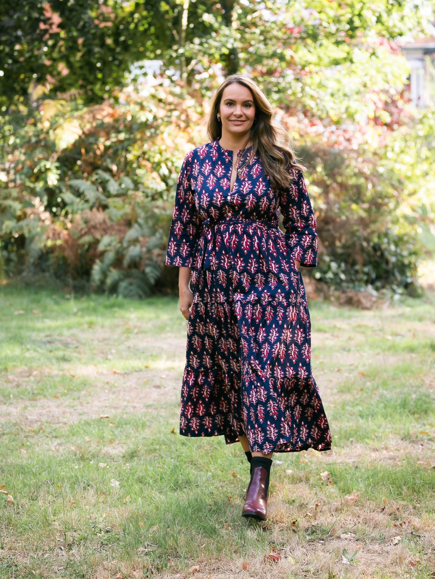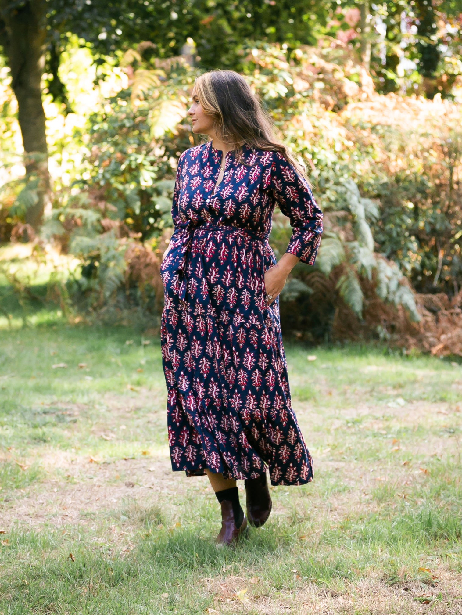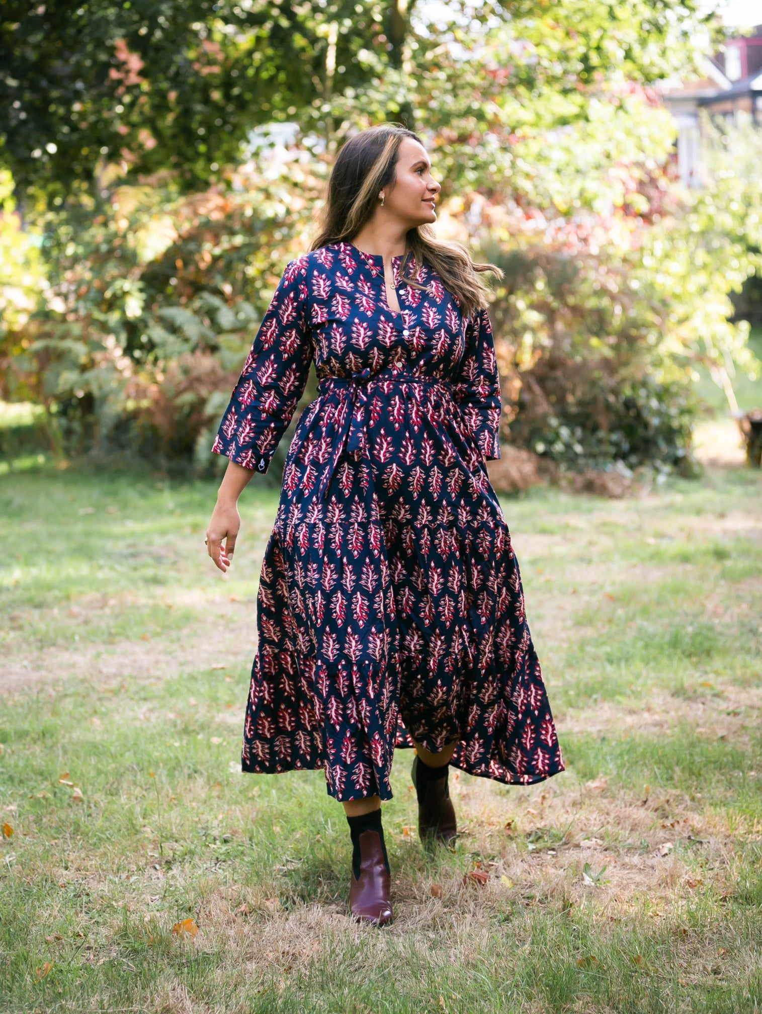 There’s no need to pack away your dresses 👗 when the temperatures drop! We’ve carried this versatile style into Autumn Winter in a range of gorgeous fabrics that will work great with Autumn-hued accessories. Our newest fabric, Flame, is a combination of classic French navy blue with a red motif and fawn accents. ‘Hope’ with its own belt as standard and some really handy pockets of course!