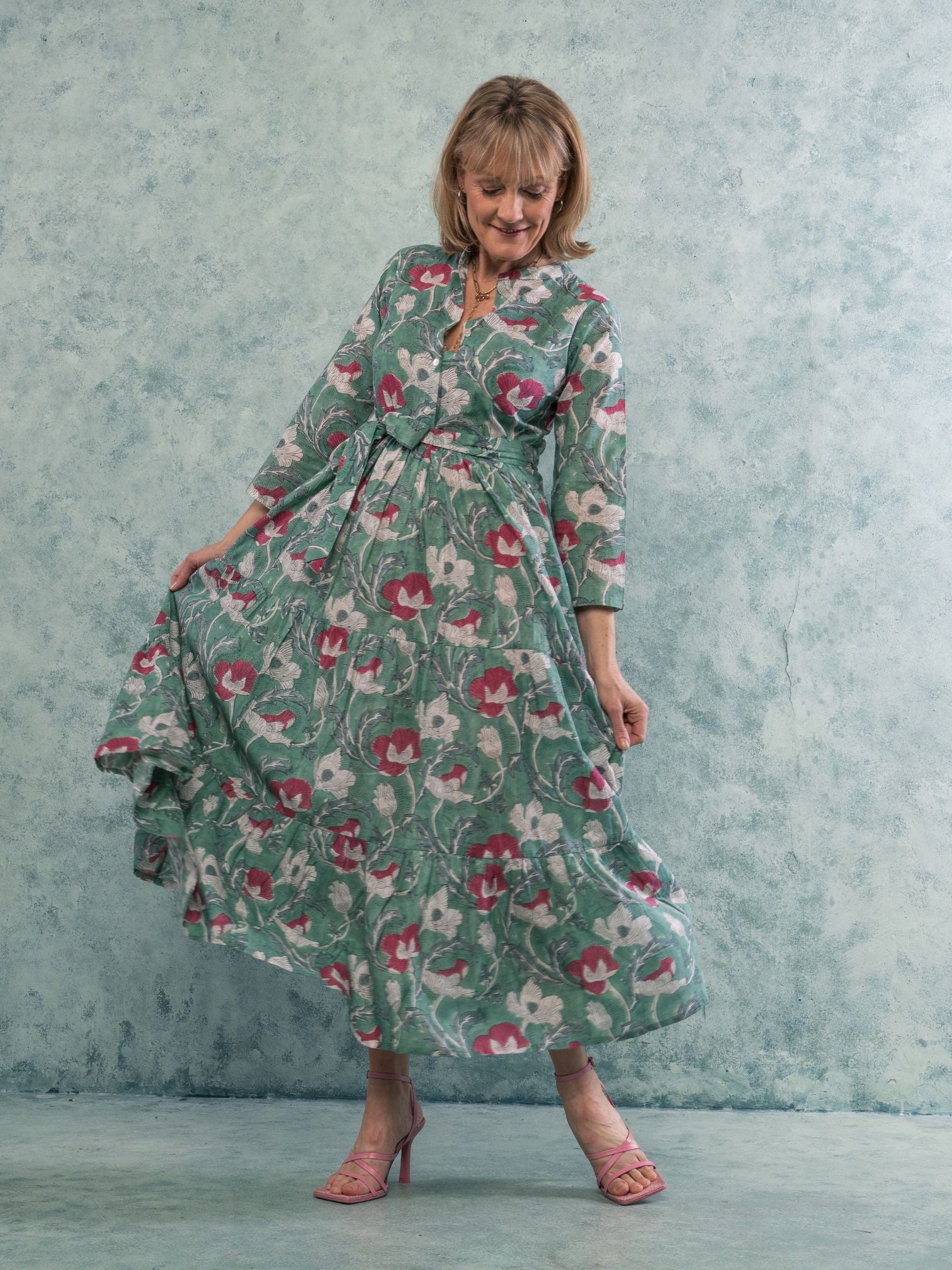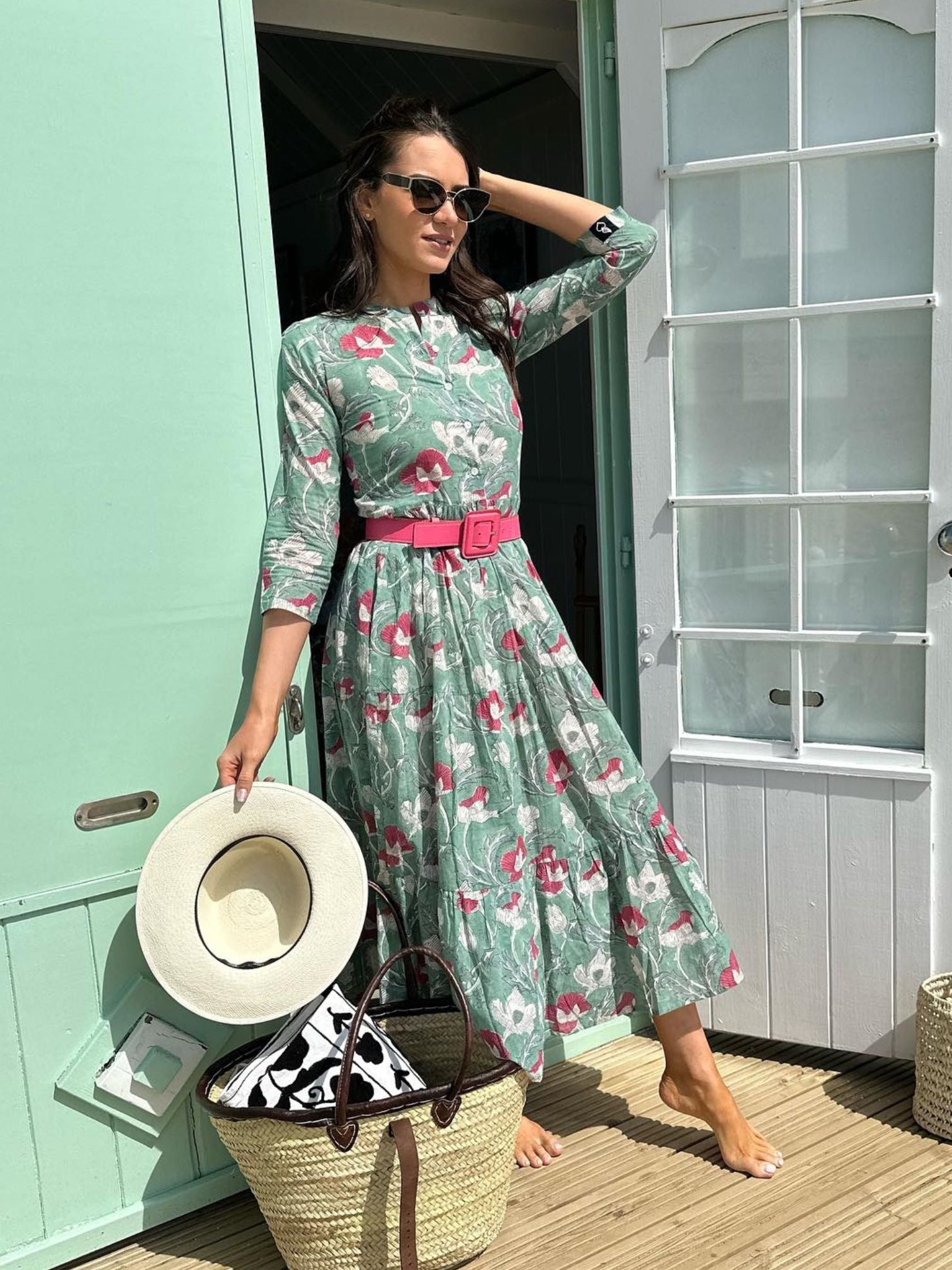 Such a beautiful dress in lovely colours and in cool cotton. I can wear it with or without the belt and the sleeves are also adaptable. It feels gorgeous on.