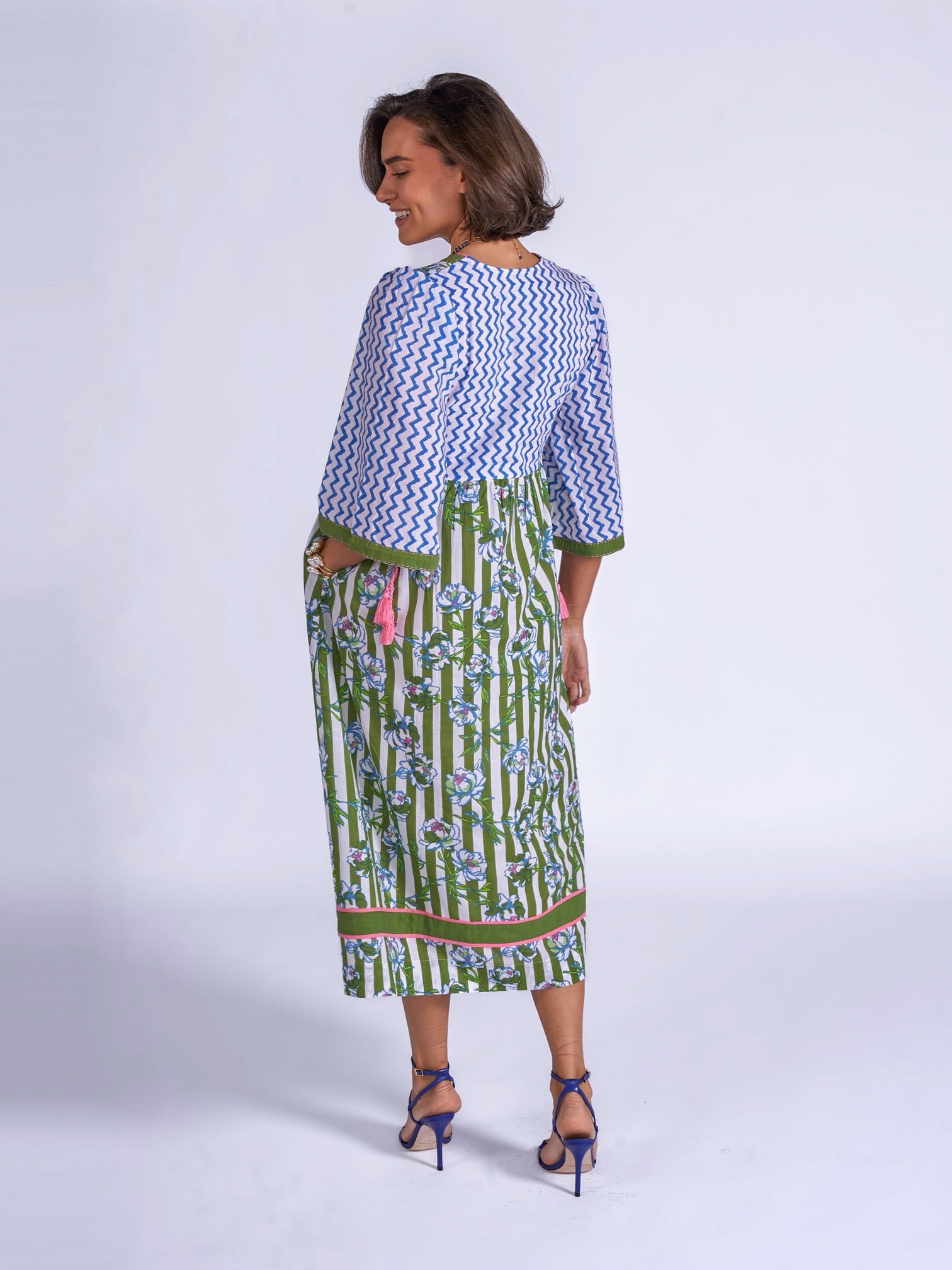 DISTINY is one seriously beautiful dress, the shades, hues, colours ,tints all combine to flatter the wearer. When worn, this dress drapes and flows most comfortably and looks graceful .I love its flow ,its long sleeves and comfortable belt and neckline. The tassels and buttons and intricate stitching make it unique. DISTINY is very feminine. I love its length. The cotton feels warm and cosy and yet cool and airy on a hot day. Inside I wore a padded T-shirt in kaki , tan sandals and I added a light beige polka dotted chiffon scarf at neck and 2 tonal necklaces and a cross over leopard bag. Again this dress is for all year around. DISTINY can be worn with a tonal knitted pashmina shawl ,coats, gilets, and booties with hats berets in the winter. In the summer , keep it simple. DISTINY is dateless and suits all age groups. A wardrobe staple.