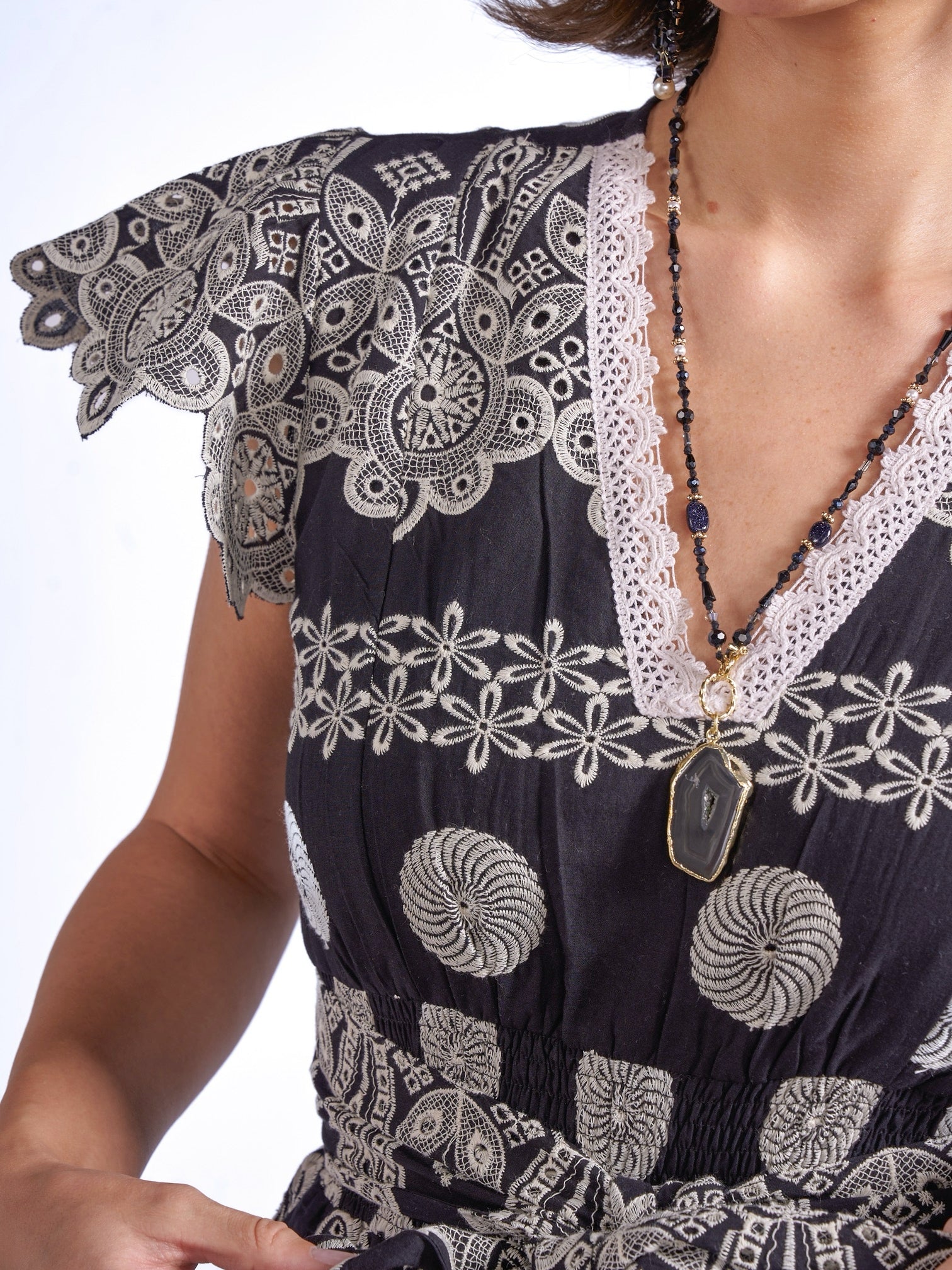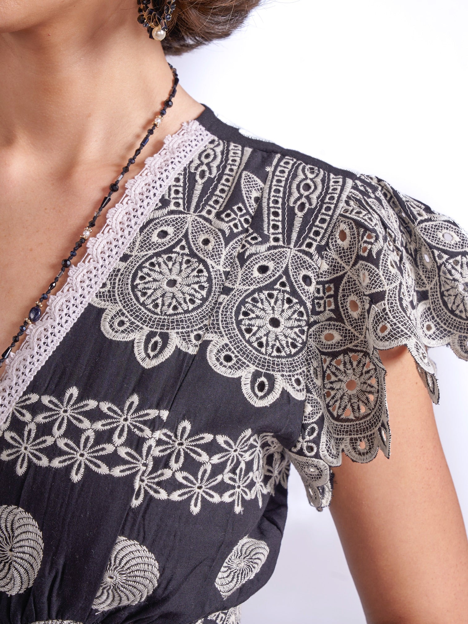 - Delicate cutout cap sleeves and hem