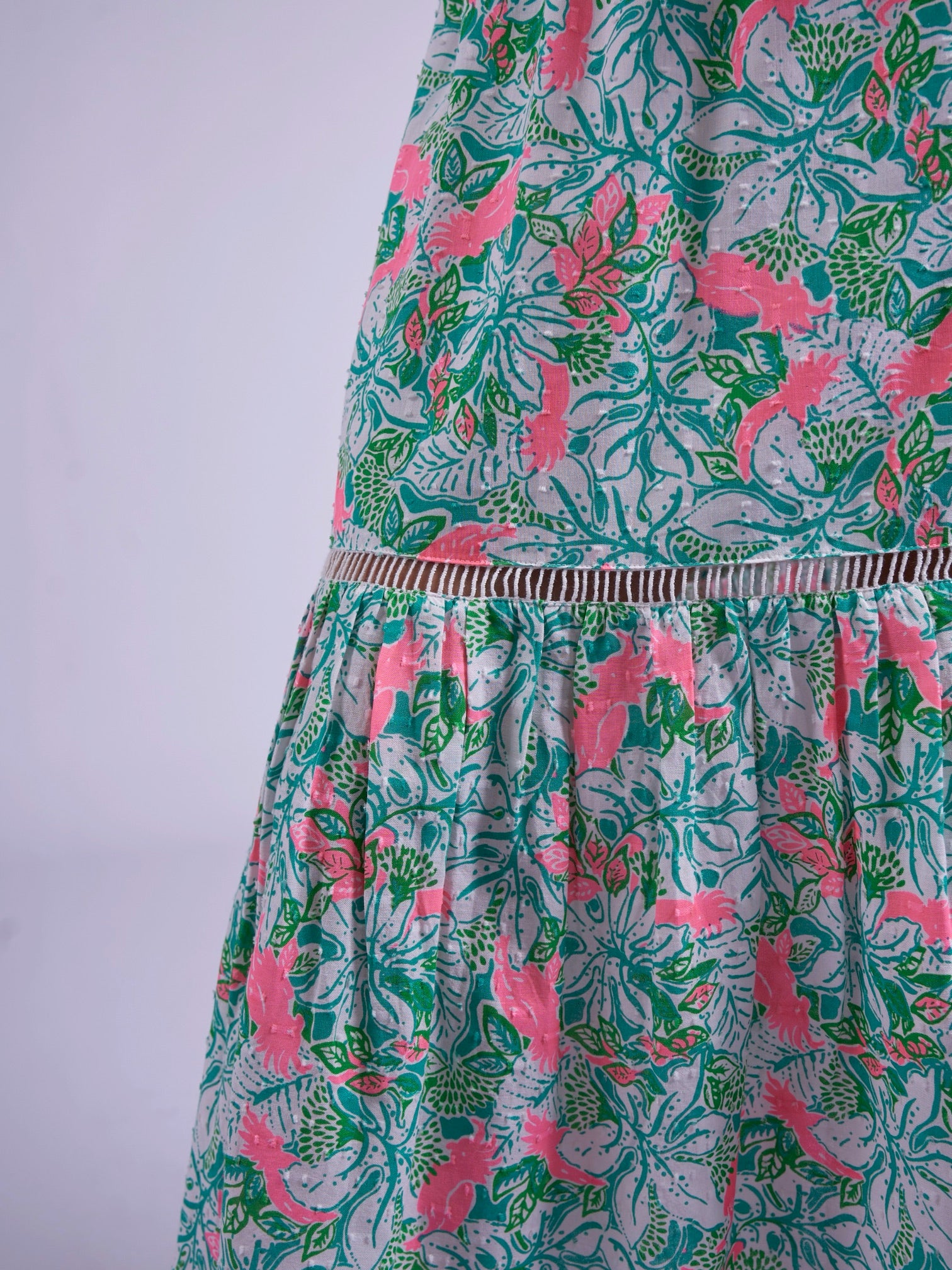 Crafted in luxurious dobby cotton, the Misha Dress in Pink Parrot combines a flattering silhouette with a playful, vibrant pattern. Finished with delicate lace trims and thoughtful detailing, it’s a beautifully made piece that feels as special as it looks — effortless, feminine and designed to stand out.