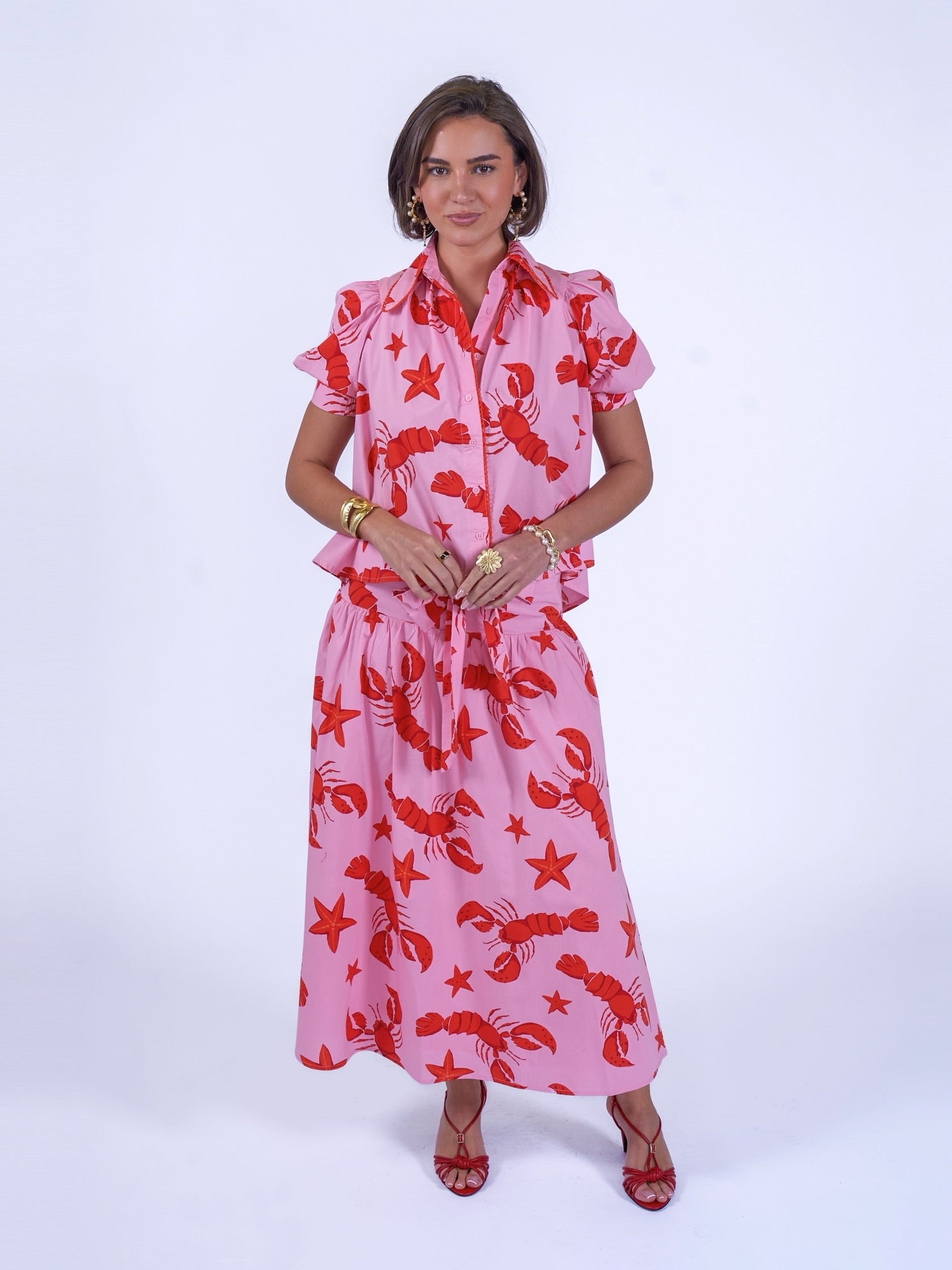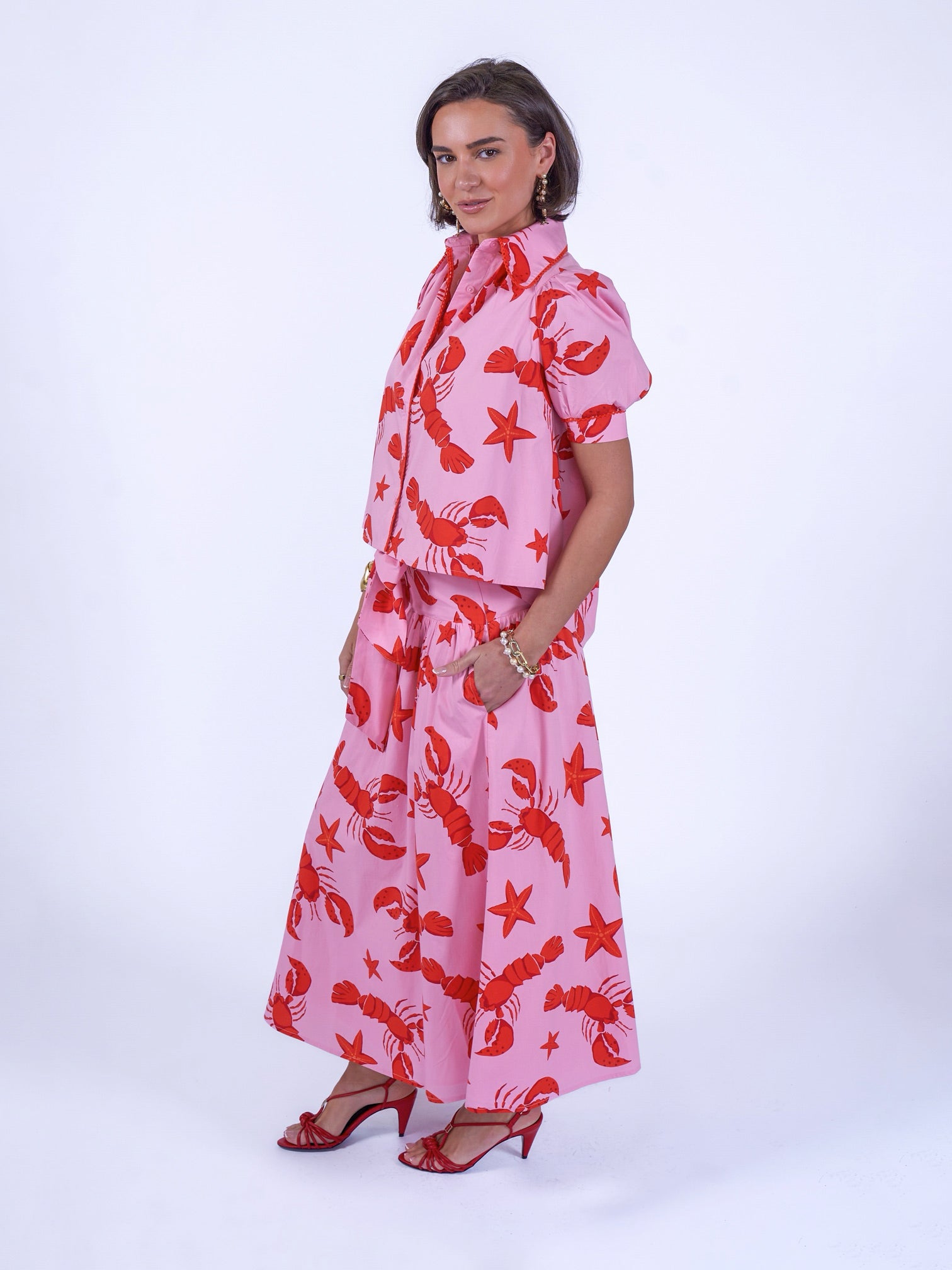 A striking skirt in our signature lobster print, designed to make an entrance. Wear with the matching blouse for a standout outfit, or pair with a simple white top for effortless days cruising the city or by the beach. Finished with a statement bow, while the smocked elastic panel at the back creates a comfortable and beautifully flattering fit.