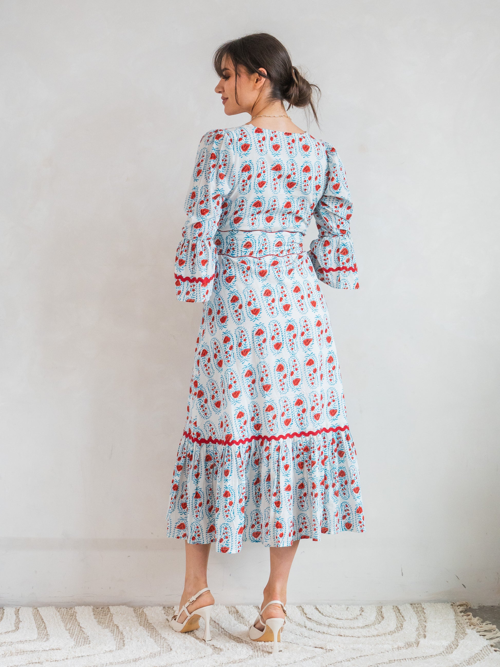 NOTE: This item is created using traditional block printing methods and is hand-made by artisans. The 'print' therefore is not always in the same position as shown in these images and can contain minor unique variations. All our dresses have pockets and come with a self-fabric belt.