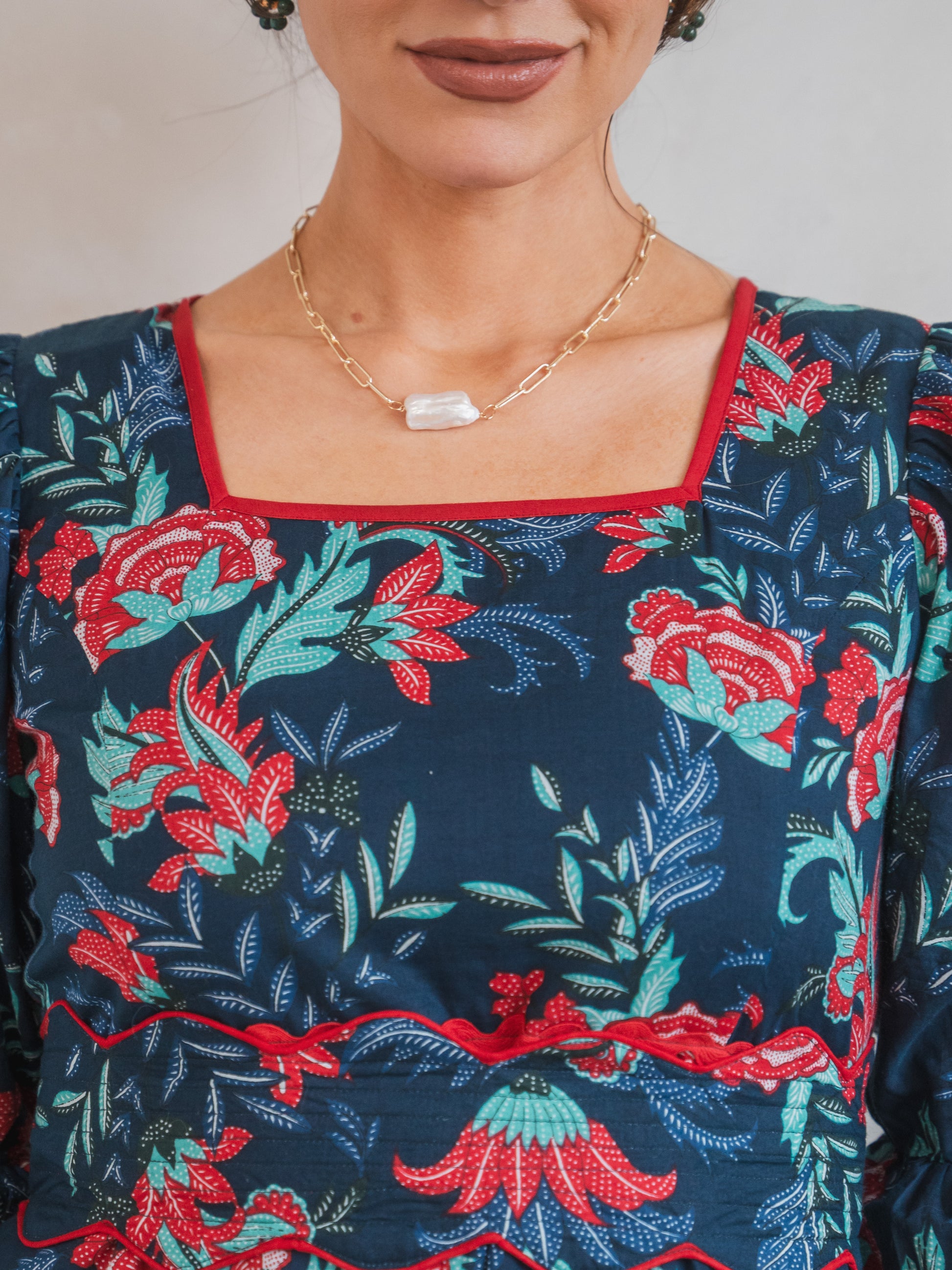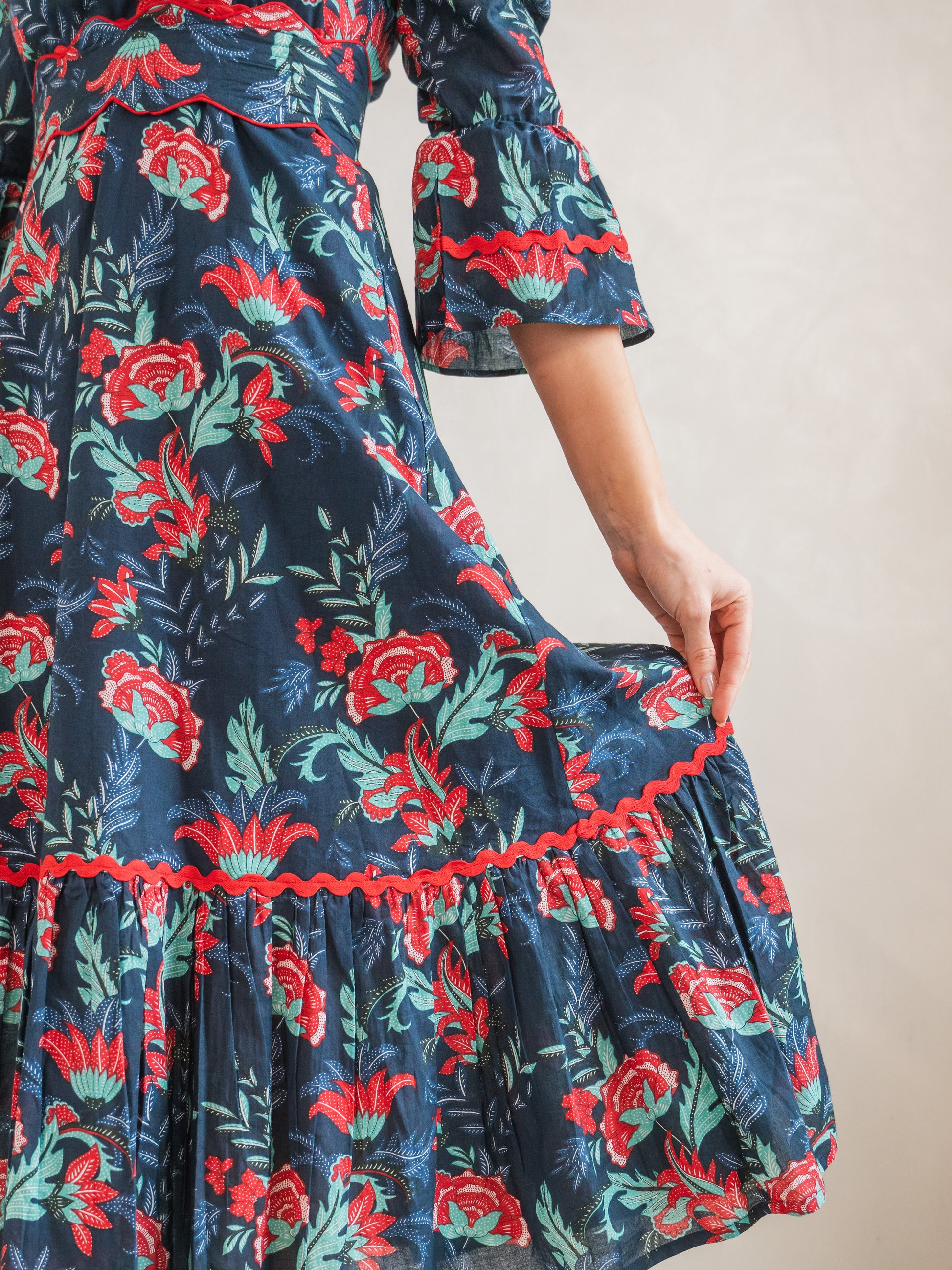 The ultimate sophisticated look in a dress. ‘Portrait’ offers refined beauty with a touch of romance. The structured square neckline frames the collarbone beautifully. Cascading into a voluminous, layered frill skirt, this dress creates an effortlessly dramatic silhouette that moves gracefully with every step. The deep blue surrounded by its intricate floral print, blooming with rich, delicate details evokes that vintage luxurious feel. Striking red hemming along the skirt adds a bold eye-catching contrast, elevating the design with a couture finish. Our ‘Portrait’ is perfect for any event where you want to captivate the room.