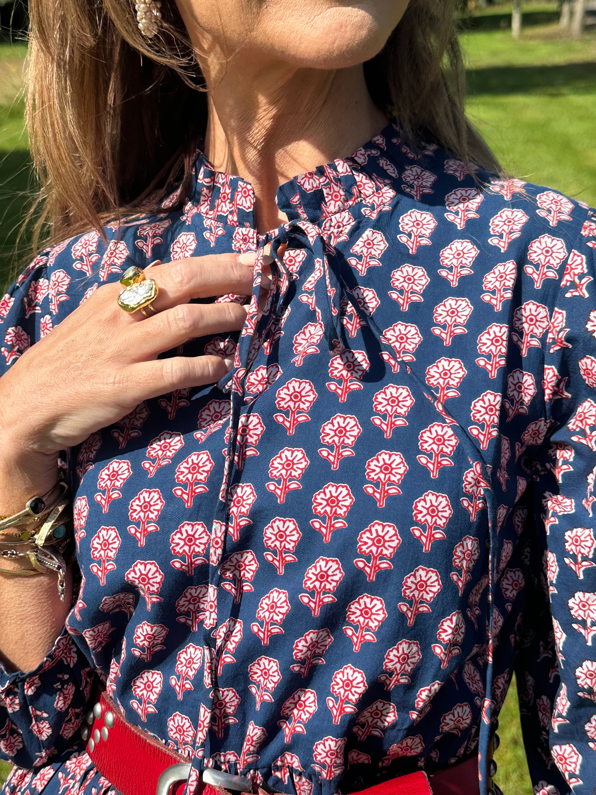- The hand printed colour combo of navy & red is a timeless classic