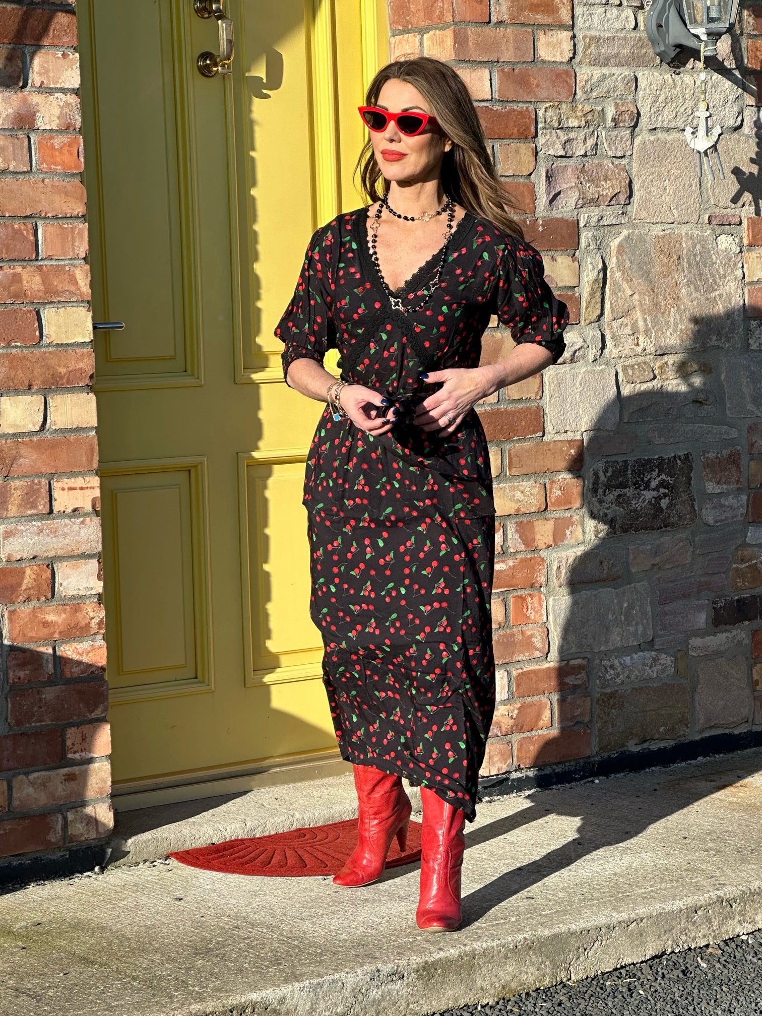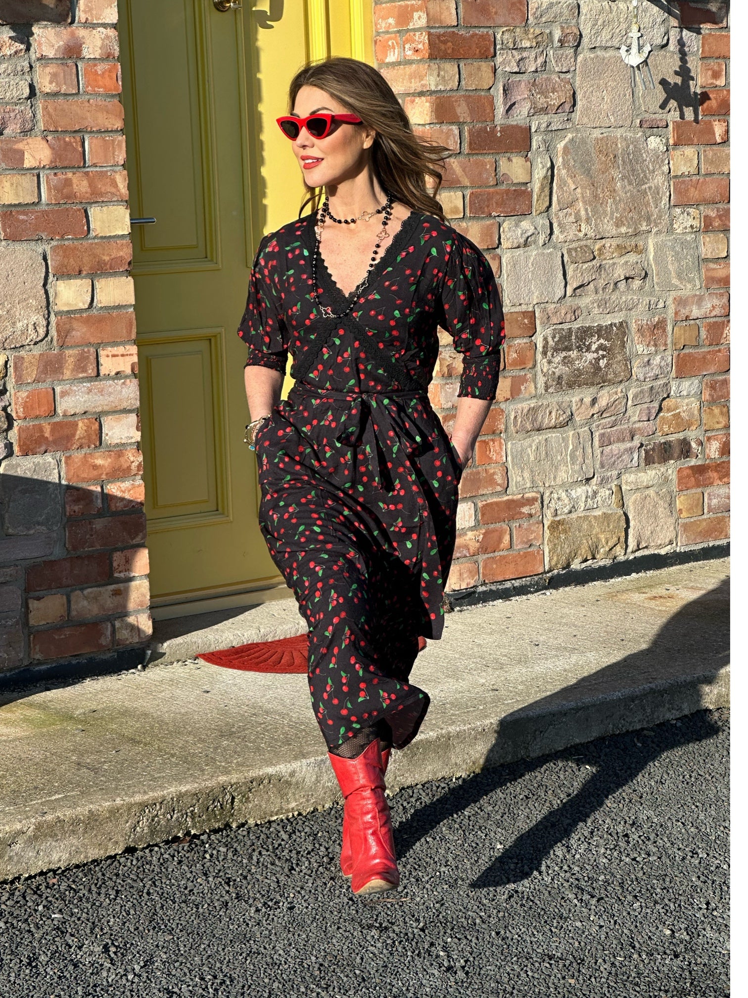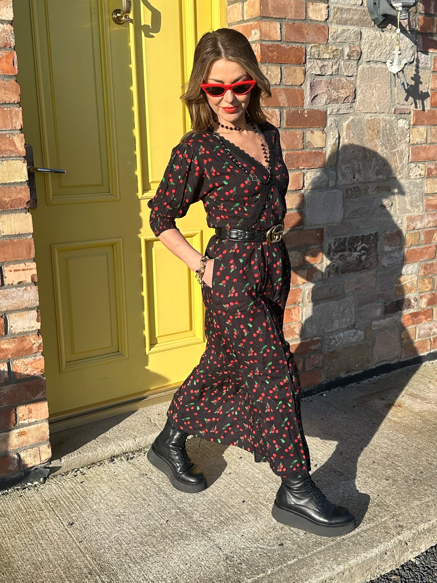 Like all of our dresses, we see versatile dressing as the route to sustainability. With its lace trims ‘Serendipity’ will stand out for dressy occasions. Pop on some red heels and a matching clutch to compliment to cherries. Swap the self-fabric belt for a studded leather one. Dress it down with a chunky black knit and boots for day-time dressing. Pair with a tailored blazer and some smart loafers for work.