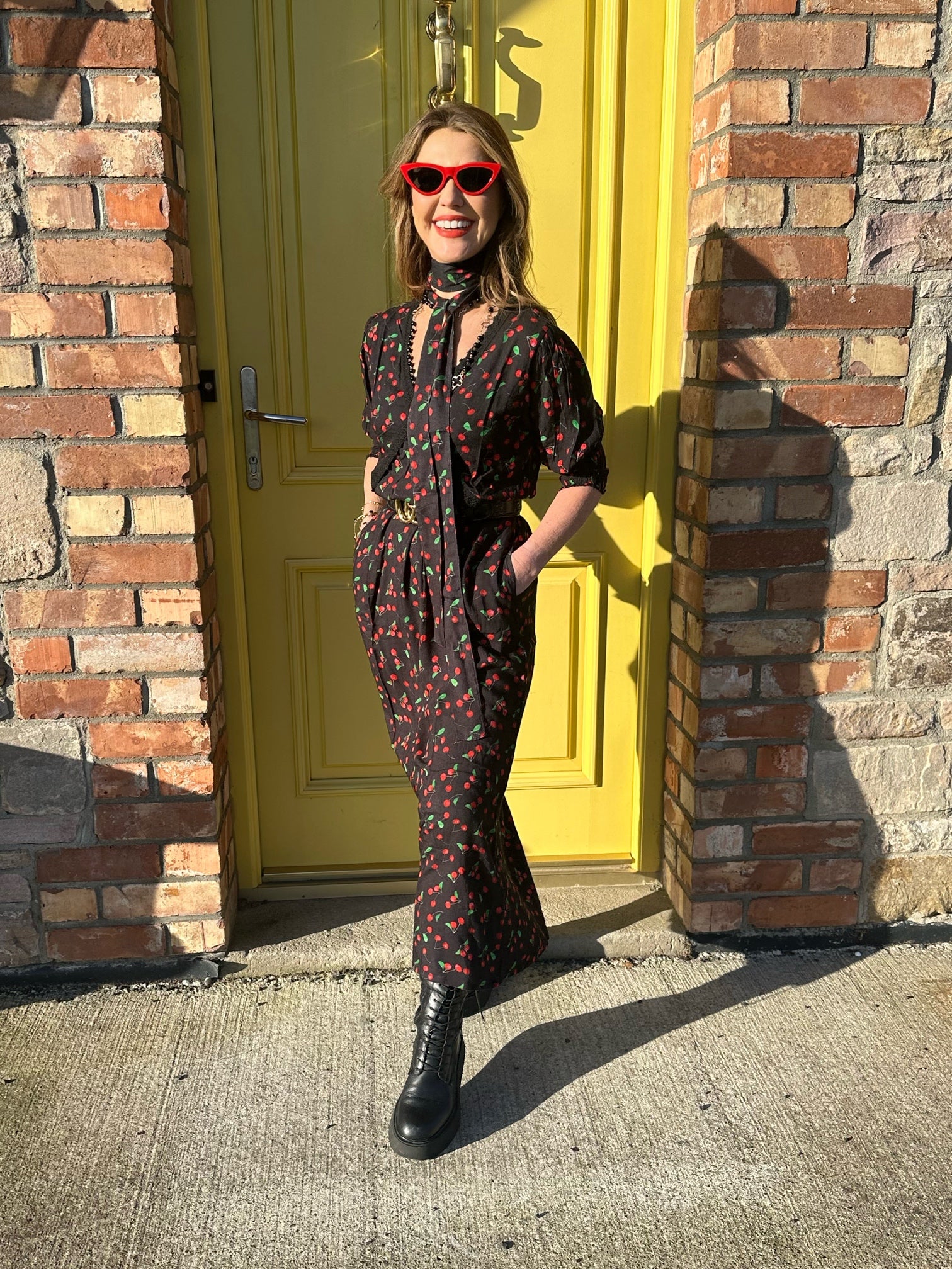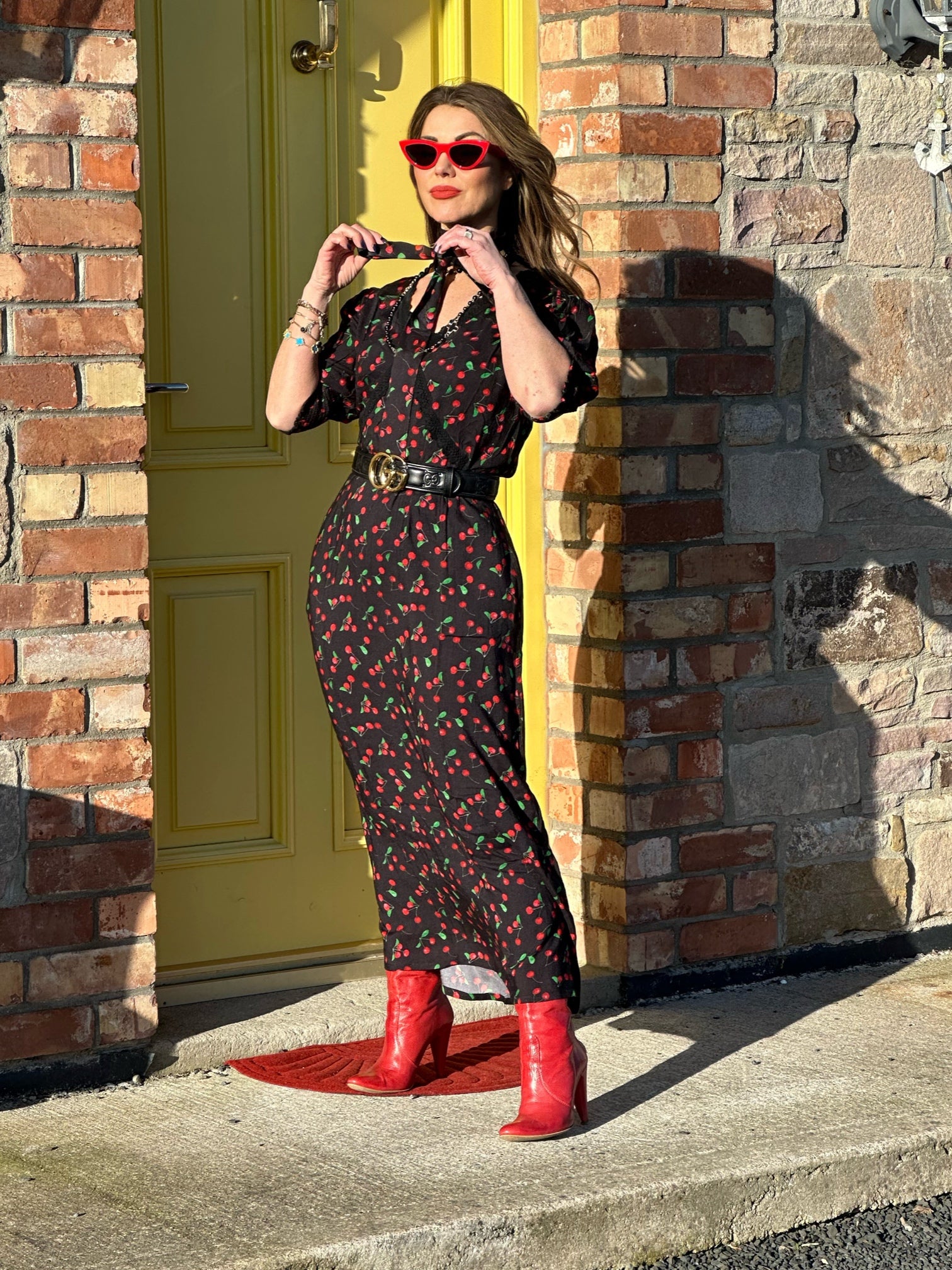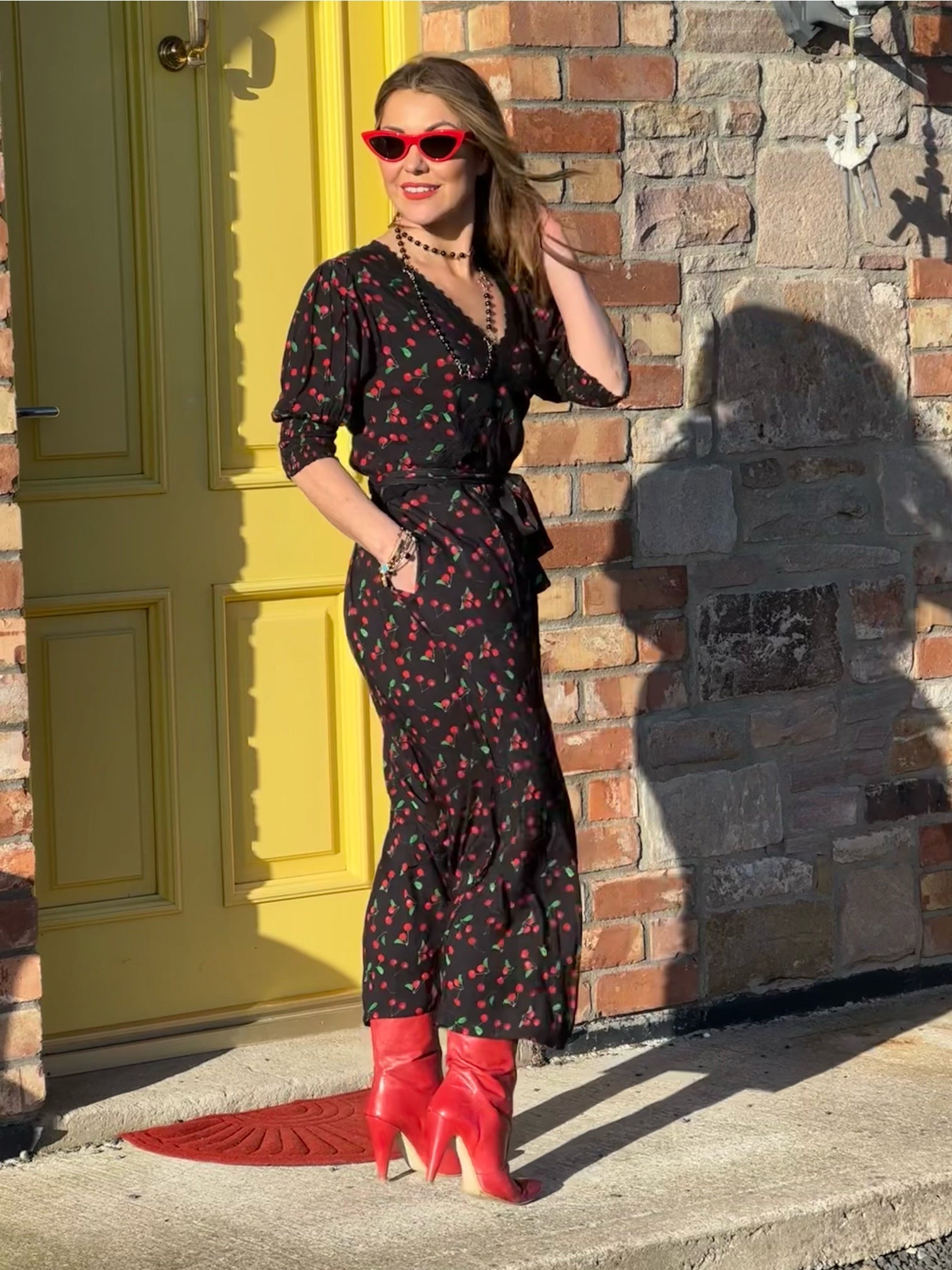 Like all of our dresses, we see versatile dressing as the route to sustainability. With its lace trims ‘Serendipity’ will stand out for dressy occasions. Pop on some red heels and a matching clutch to compliment to cherries. Swap the self-fabric belt for a studded leather one. Dress it down with a chunky black knit and boots for day-time dressing. Pair with a tailored blazer and some smart loafers for work.