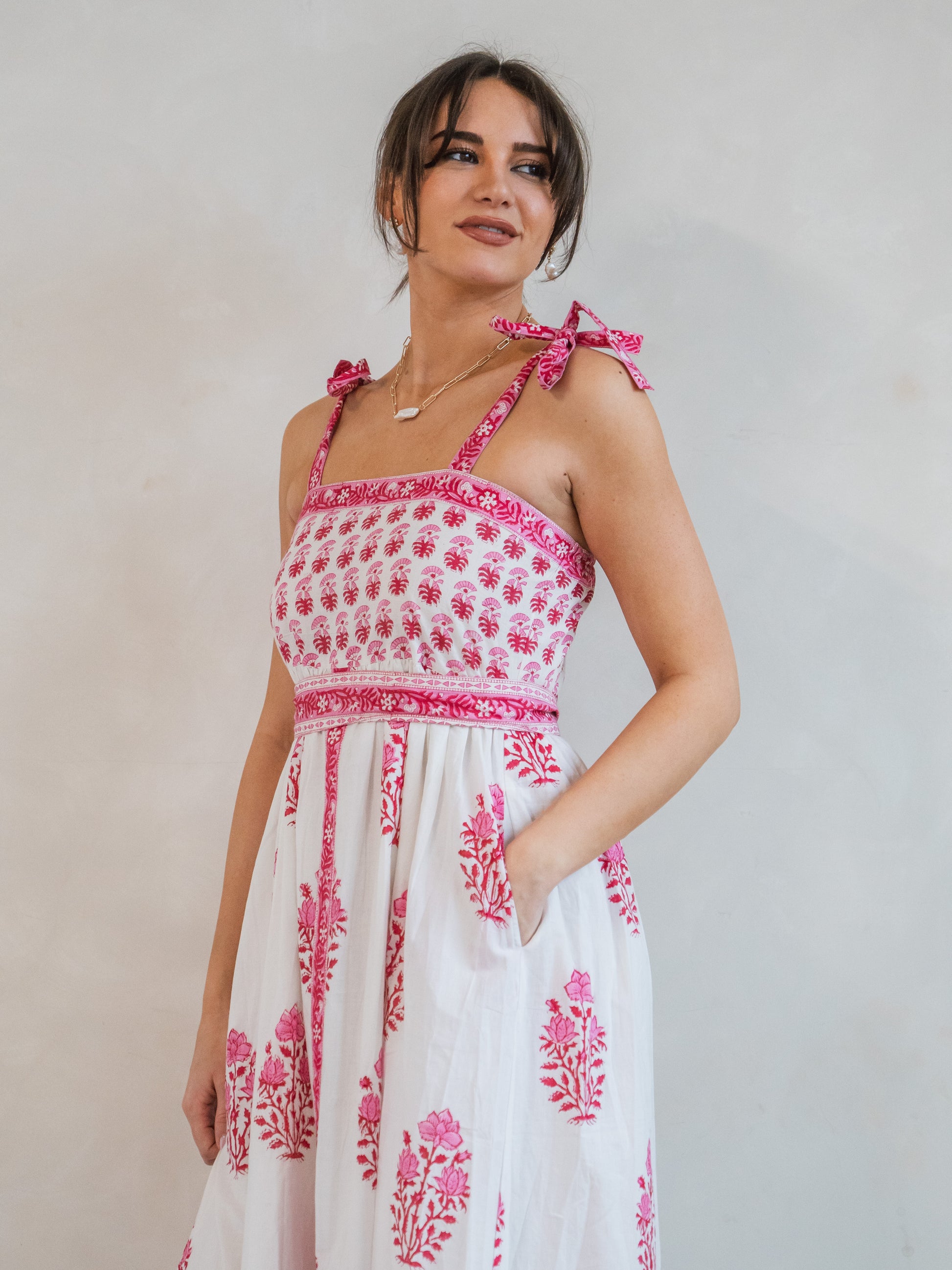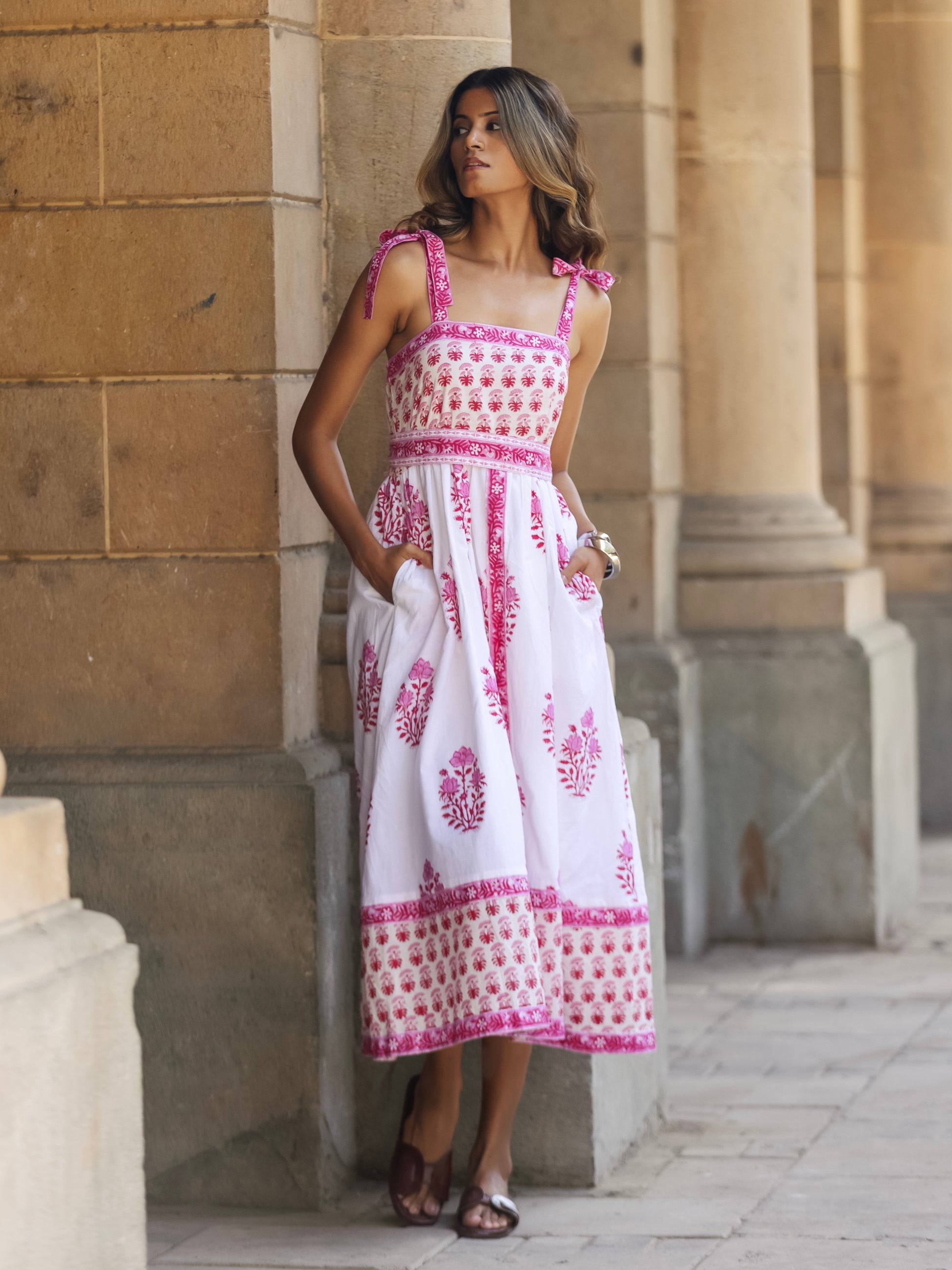 Guess who’s back!! Our best seller from two seasons ago, ‘Shore’ returns with two new, gorgeous colours. She is like a soft summer breeze- light, airy, and effortlessly beautiful! Our organic cotton sundress comes with elasticated straps and adjustable ties, which means that it can be pulled down and worn as a maxi skirt. Talk about multifunctional! Our lined iconic block print gives you that pop of colour while still radiating elegance.