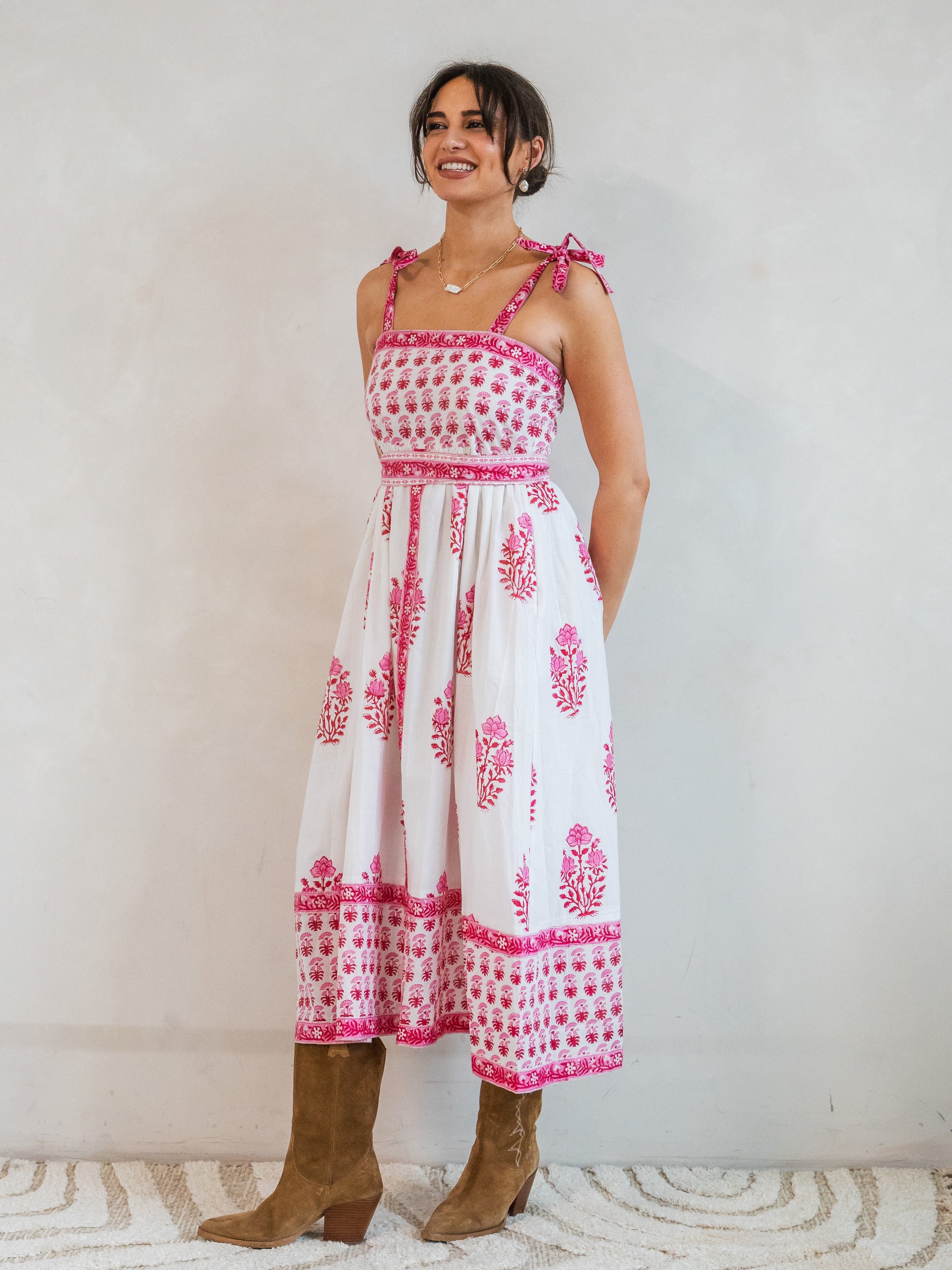 NOTE: This item is created using traditional block printing methods and is hand-made by artisans. The 'print' therefore is not always in the same position as shown in these images and can contain minor unique variations. All our dresses have pockets and come with a self-fabric belt.