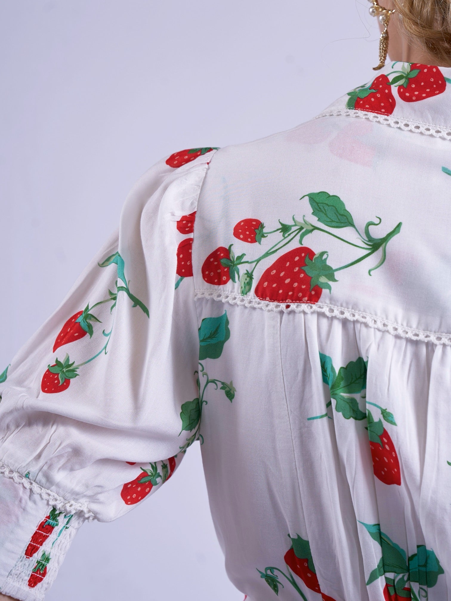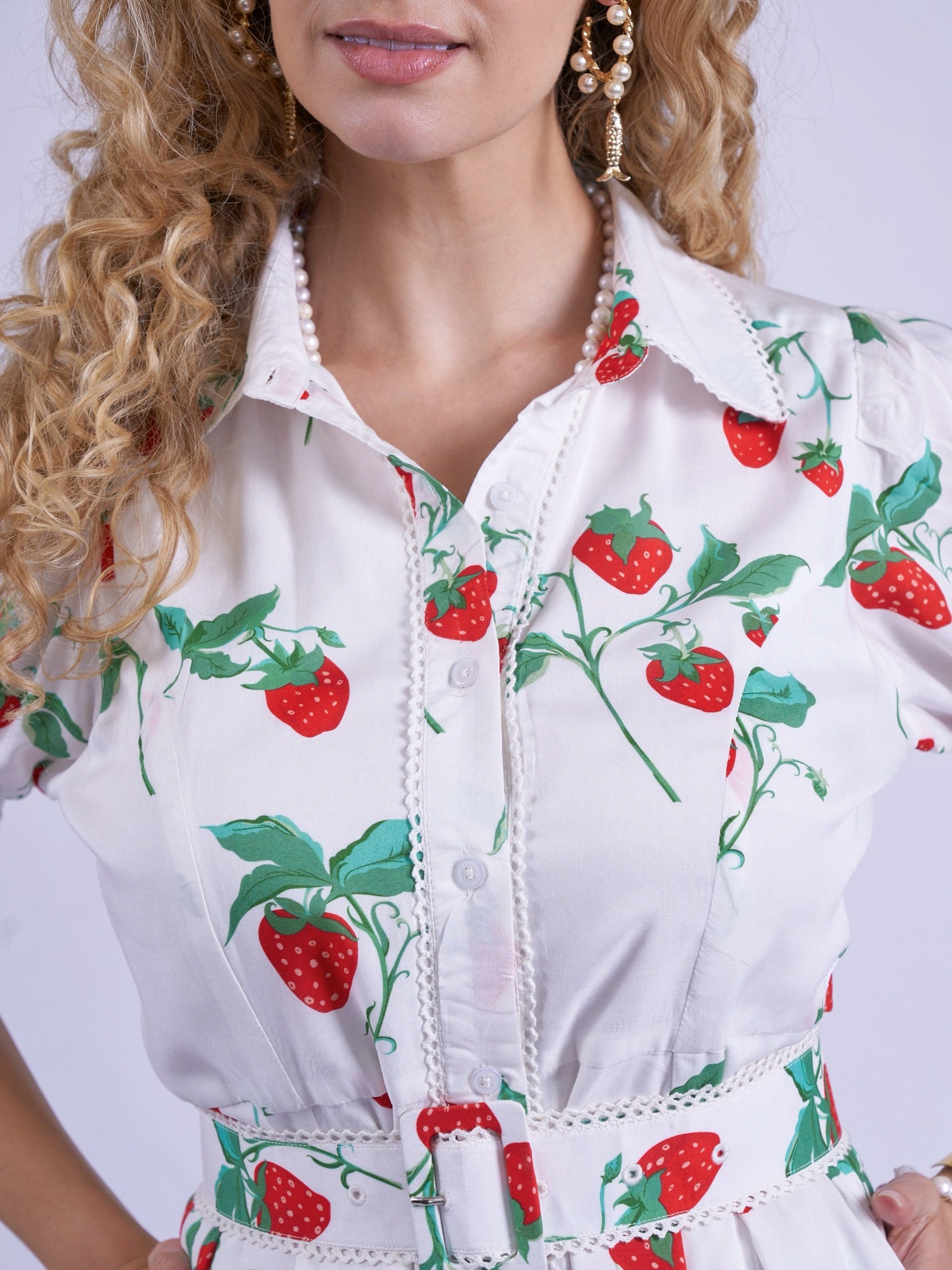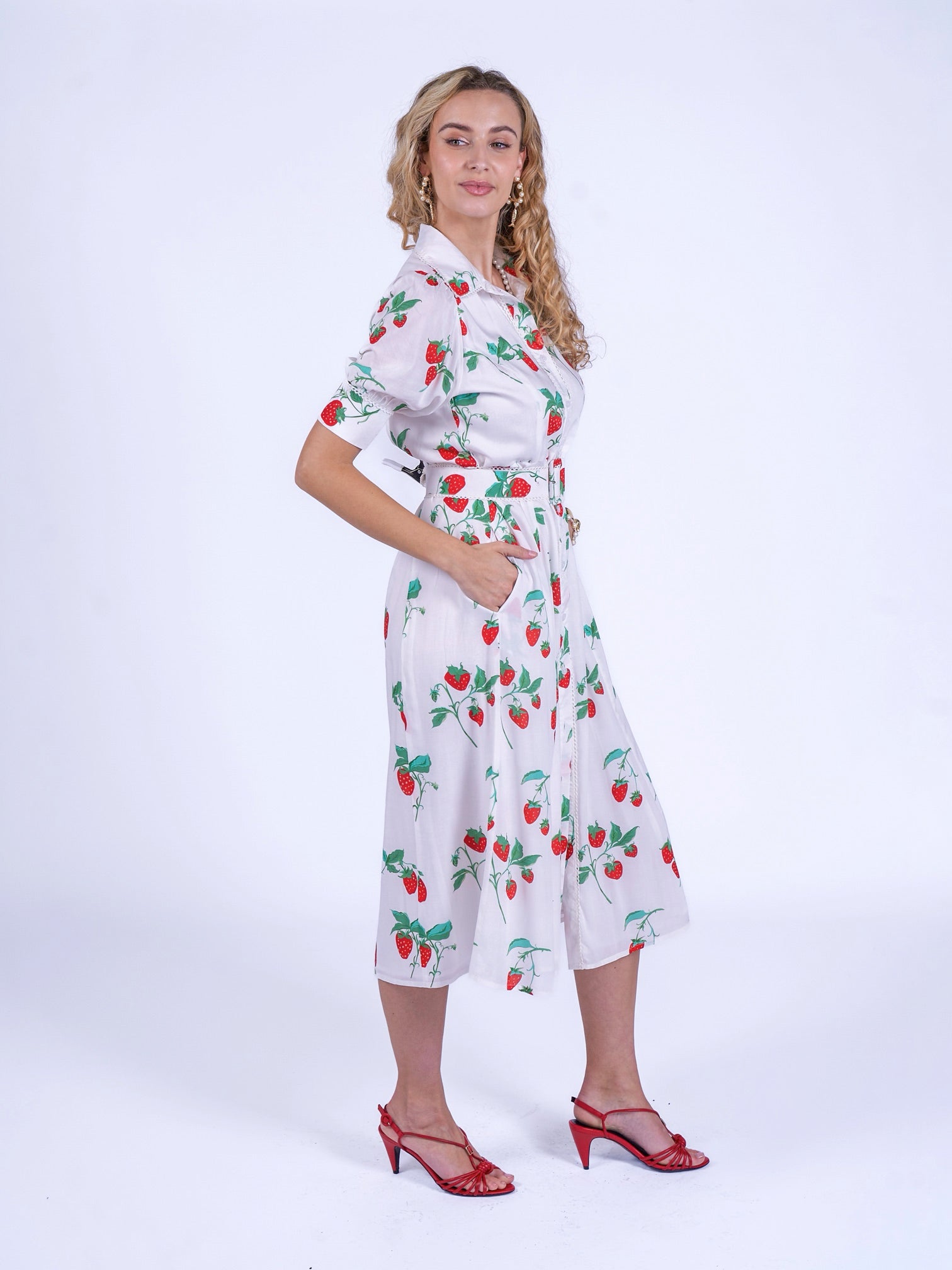 In our unique Strawberry print, the Sydney Dress is a timeless button-through shirt dress crafted in soft, fluid viscose that drapes beautifully. Finished with delicate lace trims and cut to a flattering, classic silhouette, it’s effortlessly versatile — perfect for summer days, garden parties, or even Wimbledon.