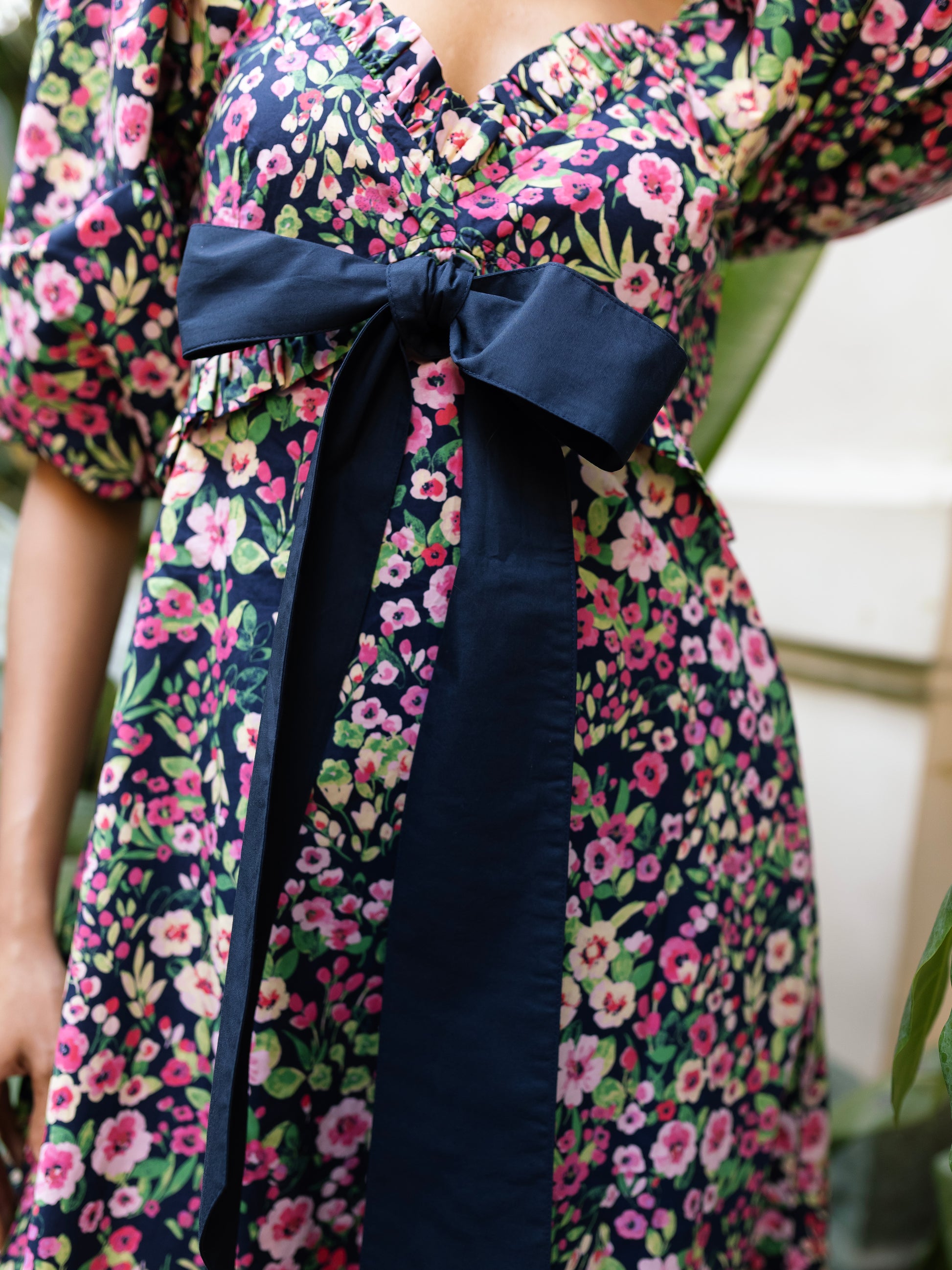 Thoughtfully designed with a flattering empire waist and crafted from exquisite poplin cotton, the Universe Dress encapsulates timeless charm and fashion-forward elegance. The oversized bow lends a couture feel, making this dress a true statement piece. Featuring a vibrant floral print set against a midnight navy background, it strikes the perfect balance between playful and chic. Whether styled for a special occasion or dressed down for daytime wear, this piece is effortlessly versatile and always elegant.